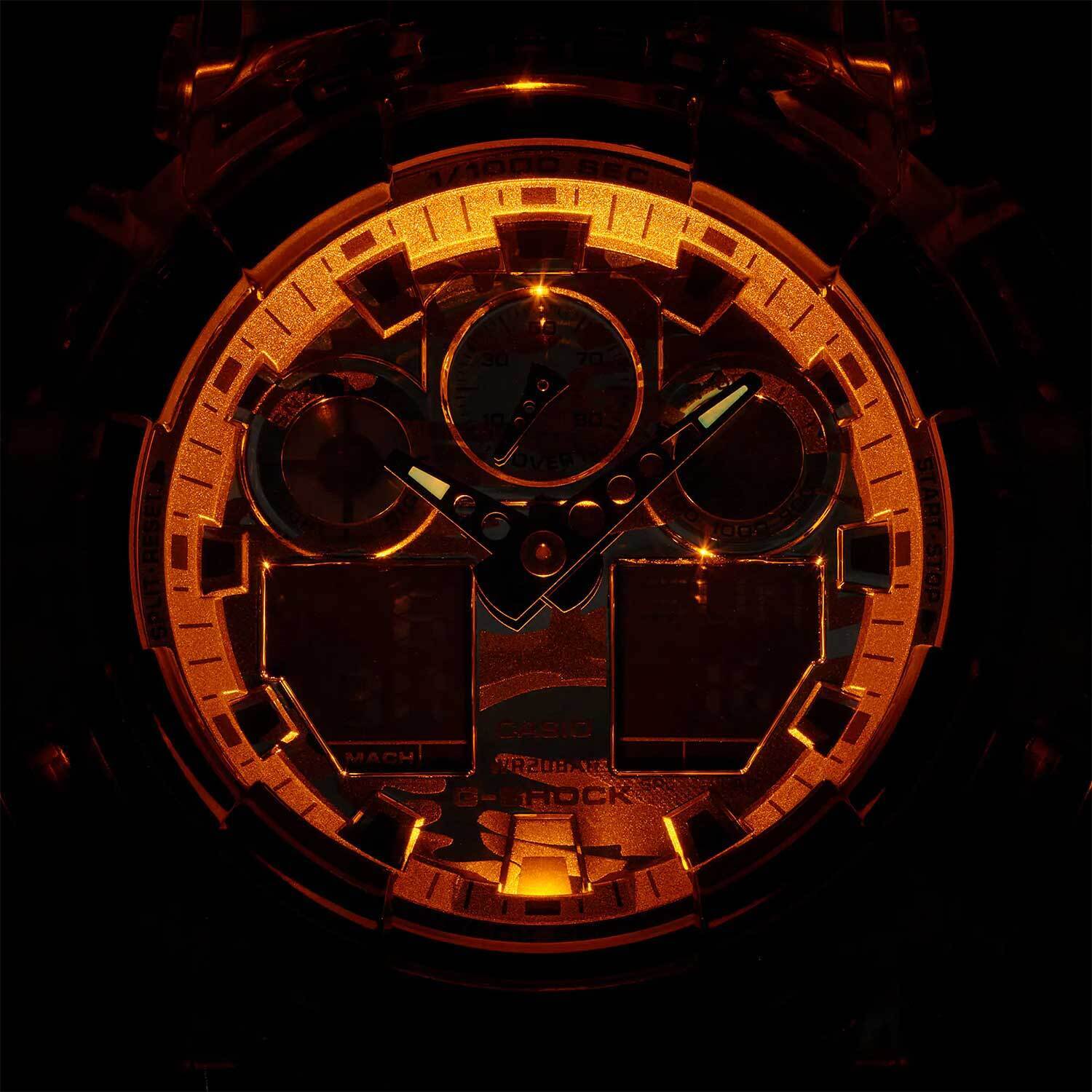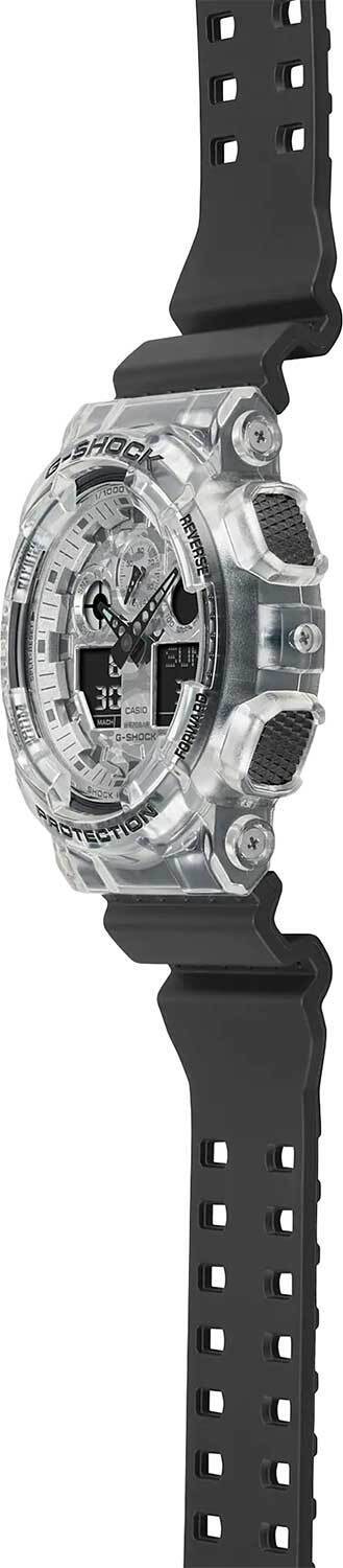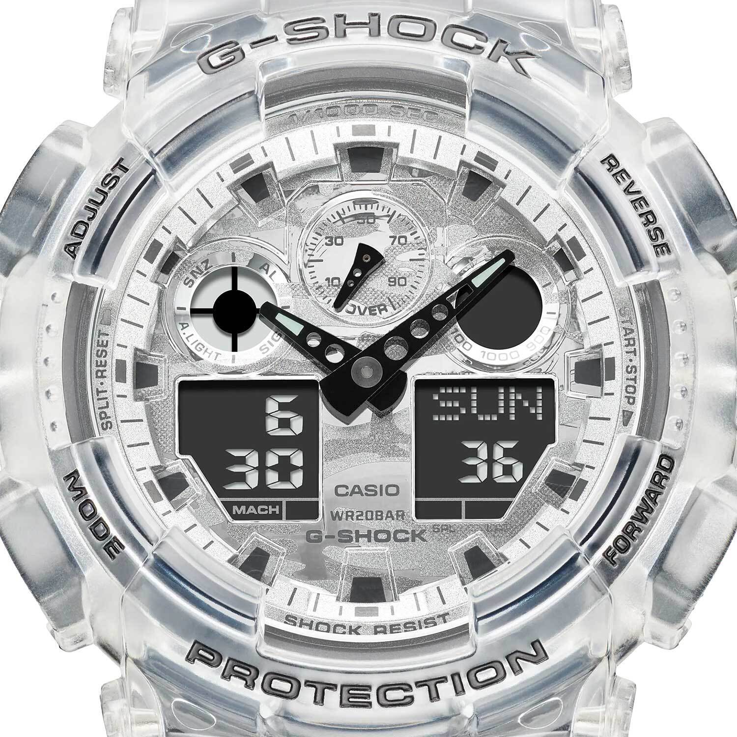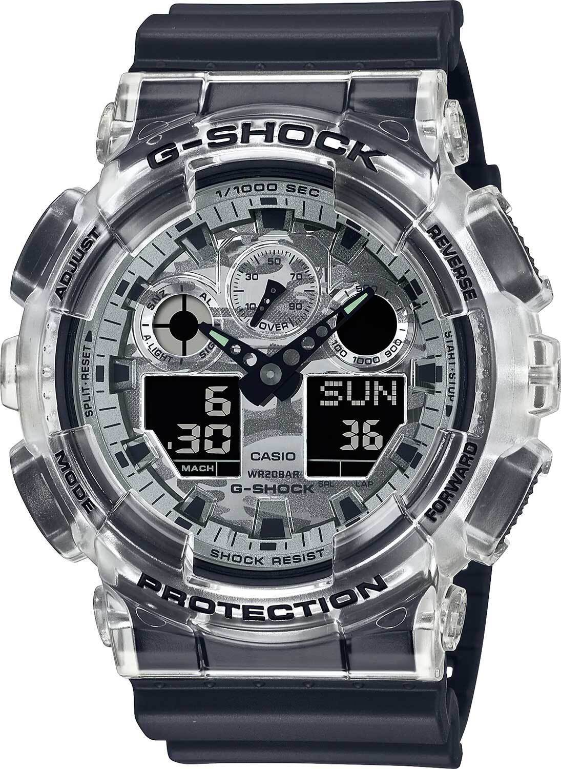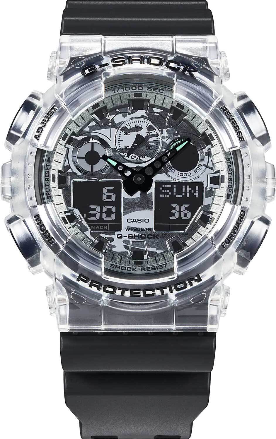 Мужские кварцевые наручные часы c аналогово-цифровым отображением времени. Серия Casio G-Shock. Противоударный корпус защищает механизм часов от ударов и вибрации. Часы созданы с защитой от воздействия магнитных полей. Автоматическая светодиодная подсветка — при недостаточном освещении поворот руки включает подсветку циферблата, выбор продолжительности подсветки 1,5 секунды или 3 секунды, послесвечение. Мировое время – 48 городов (29 часовых поясов), всемирное координированное время (UTC). Автоматический переход на зимнее и летнее время, возможность включения/отключения данной функции. 12-ти и 24-х часовой формат отображения времени. Секундомер с точностью показаний 1/1000 с и временем измерения 100 ч. Режимы измерения: пройденное время, время круга, промежуточное время. Расчет скорости по выбранной дистанции. Таймер обратного отсчета от 1 мин до 24 ч (с интервалом в 1 минуту и с интервалом в 1 час) с автоповтором. 5 ежедневных будильников, один с функцией повтора сигнала (Snooze), ежечасный сигнал. Расчет скорости по выбранной дистанции. Автоматический календарь до 2099 года. Серый циферблат с камуфляжным рисунком. Центральные часовая и минутная стрелки. Круглый корпус из полимерного полупрозрачного пластика белого цвета. Размер корпуса 55 мм на 51,2мм, толщина 16,9мм. Устойчивое к мелким механическим повреждениям минеральное стекло. Чёрный пластиковый ремешок с классической застежкой buckle. Приблизительный срок службы батареи 2 года. Водонепроницаемость 200 WR (плавание и ныряние без акваланга). Вес около 72 г.