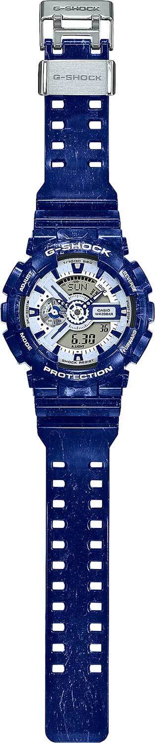 Мужские кварцевые наручные часы c аналого-цифровым отображением времени. Серия Casio G-Shock Chinese Porcelain Ceramic. Цветовая гамма часов вдохновлена знаменитым китайским фарфором. Противоударный корпус защищает механизм часов от ударов и вибрации. Часы созданы с защитой от воздействия магнитных полей. Автоматическая светодиодная подсветка — при недостаточном освещении поворот руки включает подсветку циферблата, выбор продолжительности подсветки 1,5 секунды или 3 секунды, послесвечение. Мировое время – 48 городов (29 часовых поясов), всемирное координированное время (UTC). Автоматический переход на зимнее и летнее время, возможность включения/отключения данной функции. Переключение между домашним и мировым временем. 12-ти и 24-х часовой формат отображения времени. Секундомер с точностью показаний 1/1000 с и временем измерения 100 ч. Режимы измерения: пройденное время, время круга, промежуточное время. Расчет скорости по выбранной дистанции. Таймер обратного отсчета от 1 мин до 24 ч (с интервалом в 1 минуту и с интервалом в 1 час) с автоповтором. 5 ежедневных будильников, один с функцией повтора сигнала (Snooze), ежечасный сигнал. Автоматический календарь до 2099 года. Круглый корпус из полимерного пластика синего цвета. Размер корпуса 51,2 мм на 55мм, толщина 16,9мм. Задняя крышка украшена гравировкой. Устойчивое к мелким механическим поврежедениям минеральное стекло. Синий ппластиковый ремешок с классической застежкой Buckle. Приблизительный срок службы батареи 2 года. Водонепроницаемость 200 WR (плавание и ныряние без акваланга). Вес около 72 г.
