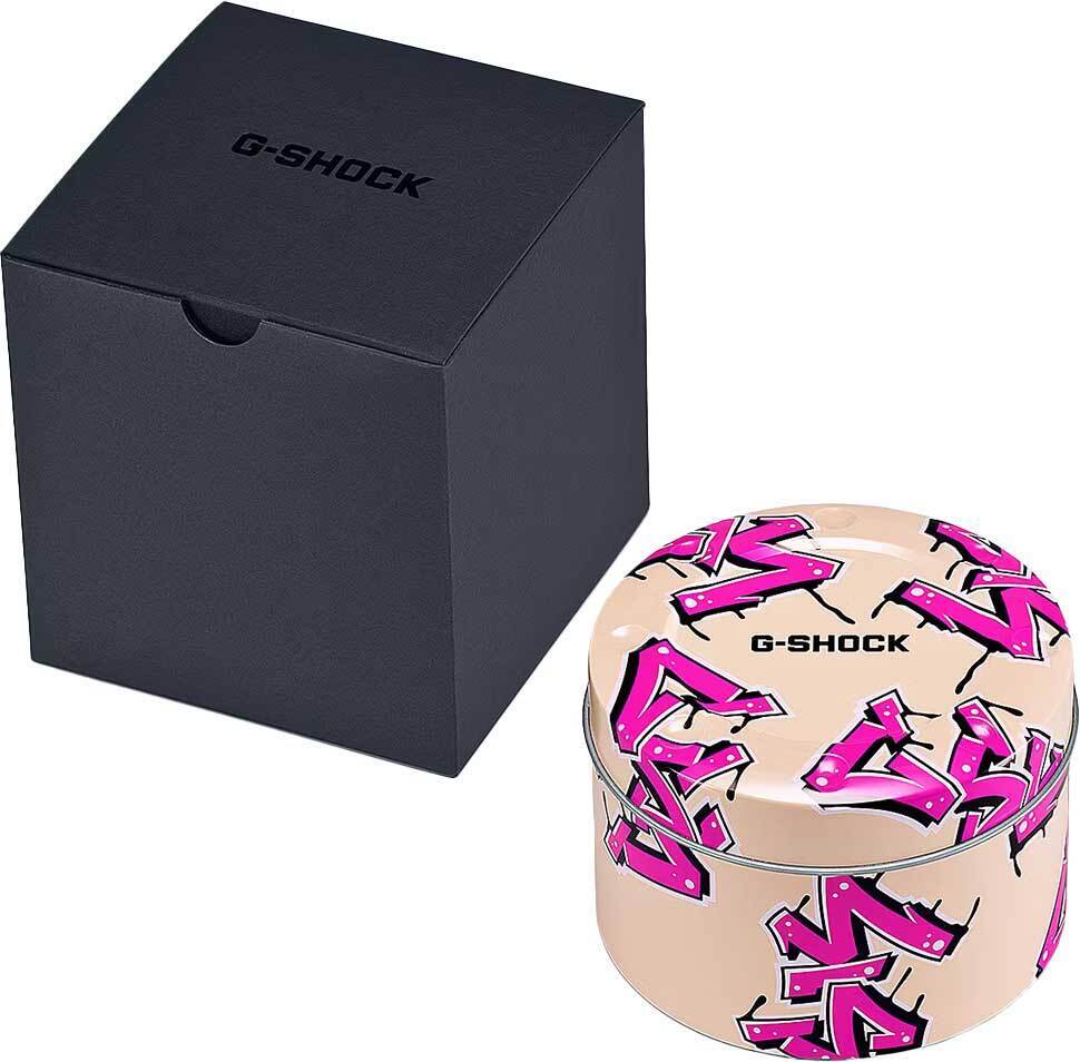 Мужские кварцевые наручные часы c аналого-цифровым отображением времени. Серия Casio G-Shock Limited. Модель выпущена ограниченной серией. Дизайн часов вдохновлен уличным искусством граффити. Противоударный корпус защищает механизм часов от ударов и вибрации. Часы созданы с защитой от воздействия магнитных полей. Автоматическая светодиодная подсветка — при недостаточном освещении поворот руки включает подсветку циферблата, выбор продолжительности подсветки 1,5 секунды или 3 секунды, послесвечение. Мировое время – 48 городов (29 часовых поясов), всемирное координированное время (UTC). Автоматический переход на зимнее и летнее время, возможность включения/отключения данной функции. 12-ти и 24-х часовой формат отображения времени. Секундомер с точностью показаний 1/1000 с и временем измерения 100 ч. Режимы измерения: пройденное время, время круга, промежуточное время. Расчет скорости по выбранной дистанции. Таймер обратного отсчета от 1 мин до 24 ч (с интервалом в 1 минуту и с интервалом в 1 час) с автоповтором. 5 ежедневных будильников, один с функцией повтора сигнала (Snooze), ежечасный сигнал. Автоматический календарь до 2099 года. Круглый корпус из полимерного пластика. Устойчивое к мелким механическим поврежедениям минеральное стекло. Ппластиковый ремешок с классической застежкой Buckle. Корпус и ремешок украшены яркой надпистью в стиле граффити. Для часов разработана специальная упаковка. Приблизительный срок службы батареи 2 года. Водонепроницаемость 200 WR (плавание и ныряние без акваланга). Вес около 72 г.