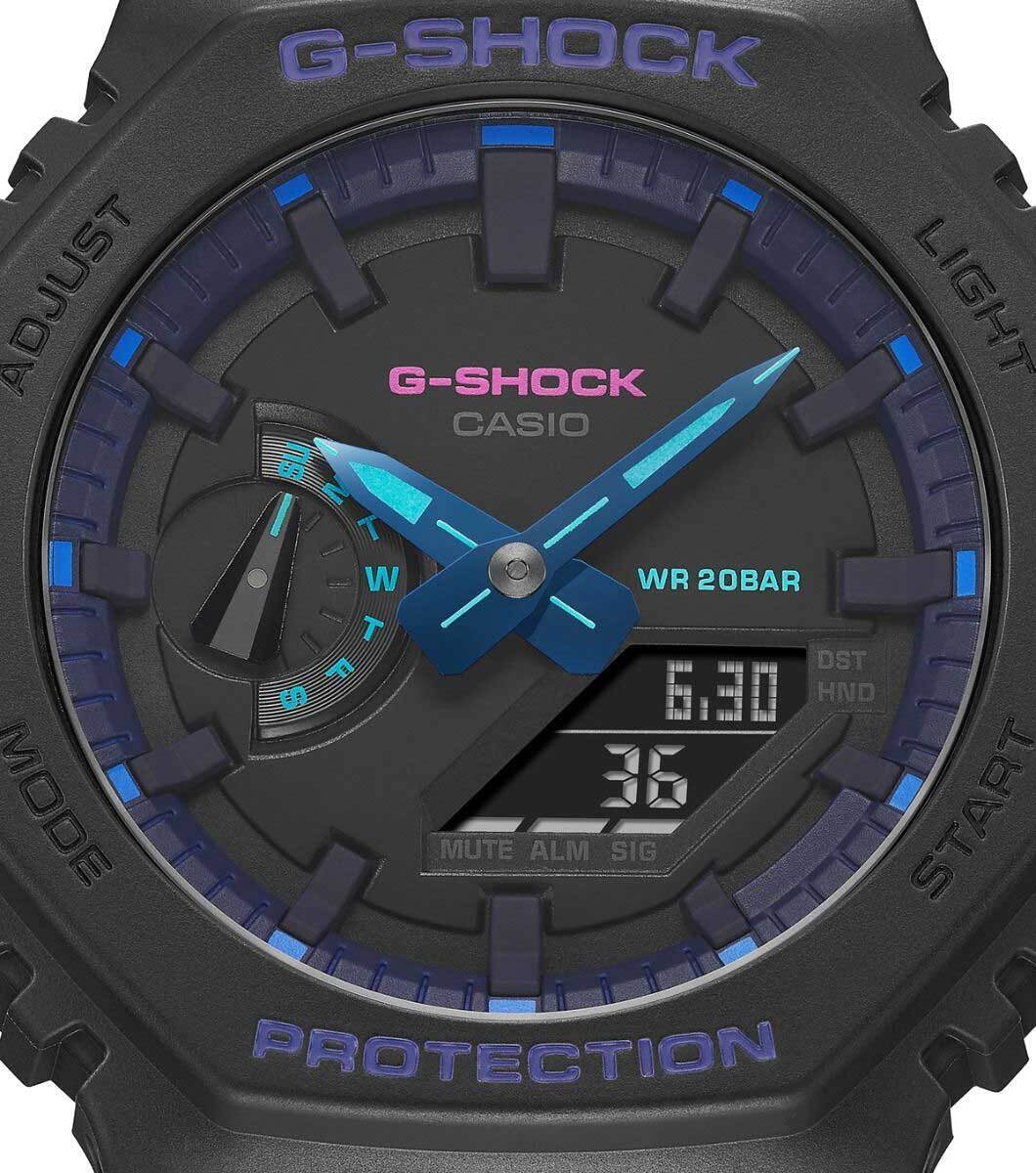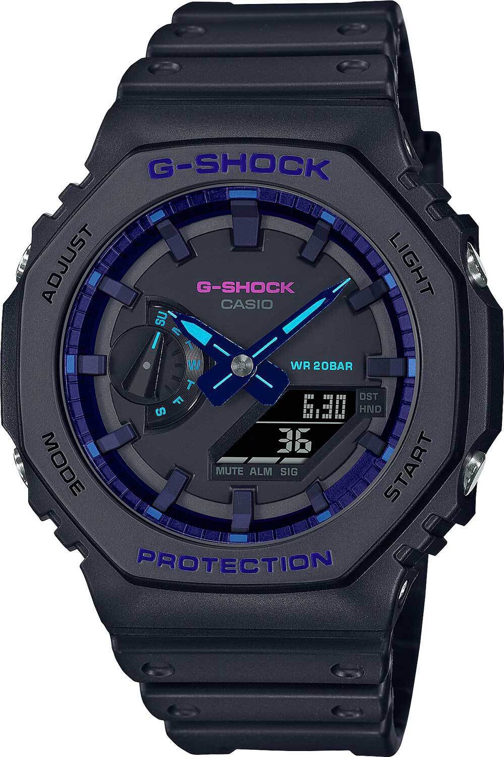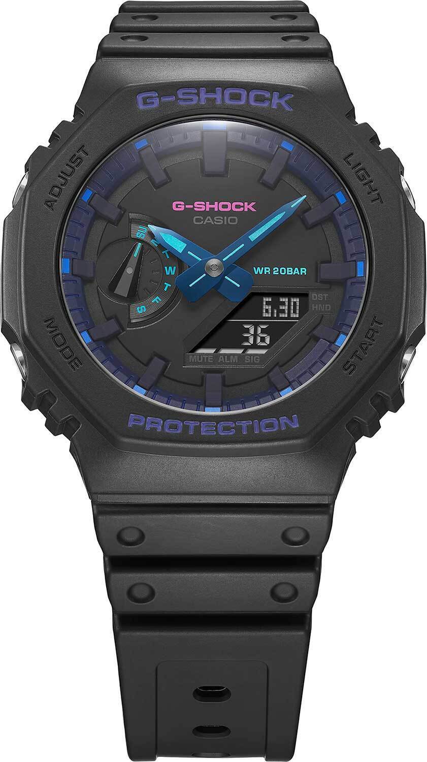 Мужские кварцевые аналогово-цифровые наручные часы. Серия G-Shock Virtual Blue. Отличительная особенность модели в том, что базовая черная окраска часов дополнена яркими неоновыми деталями корпуса и циферблата, что создает футуристическую атмосферу виртуальной реальности. Противоударный пластиковый корпус с углеродными волокнами (структура Carbon Core Guard) более прочный и в то же время более легкий, защищает механизм часов от ударов и вибраций. Двойная светодиодная подсветка обеспечивает подсветку не только цифрового дисплея, но и аналогового циферблата. Настройка продолжительности подсветки 1,5 или 3 секунды, послесвечение. Светящееся покрытие стрелок обеспечивает длительную подсветку в темное время суток после короткого воздействия света. 12-ти и 24-х часовой формат отображения времени. Ретроградный стрелочный указатель для недели. Секундомер с точностью показаний 1/100 с (первый час) и 1 с (после первого часа) и временем измерения 24 часа. Режимы измерения: прошедшее время, промежуточное время, два финишных результата. Таймер обратного отсчета от 1 секунды до 24 часов (с интервалом в 1 секунду) с автоповтором. Мировое время - 31 часовой пояс (48 городов), всемирное координированное время (UTC), включение/отключение летнего времени. 5 ежедневных будильников, ежечасный сигнал. Функция перемещения стрелок. Функция отключения/включения звука кнопок. Автоматический календарь до 2099 года. Чёрный циферблат с сине-фиолетовыми стрелками и метками. Усиленный углеродными волокнами пластиковый восьмиугольный корпус чёрного цвета. Размеры корпуса 48,5 мм на 45,4 мм, толщина 11,8 мм. Устойчивое к мелким механическим повреждениям минеральное стекло. Чёрный пластиковый ремешок со стандартной застёжкой Buckle. Водонепроницаемость 200WR (плавание и ныряние без акваланга). Примерный срок службы батареи 3 года. Вес около 51 г.