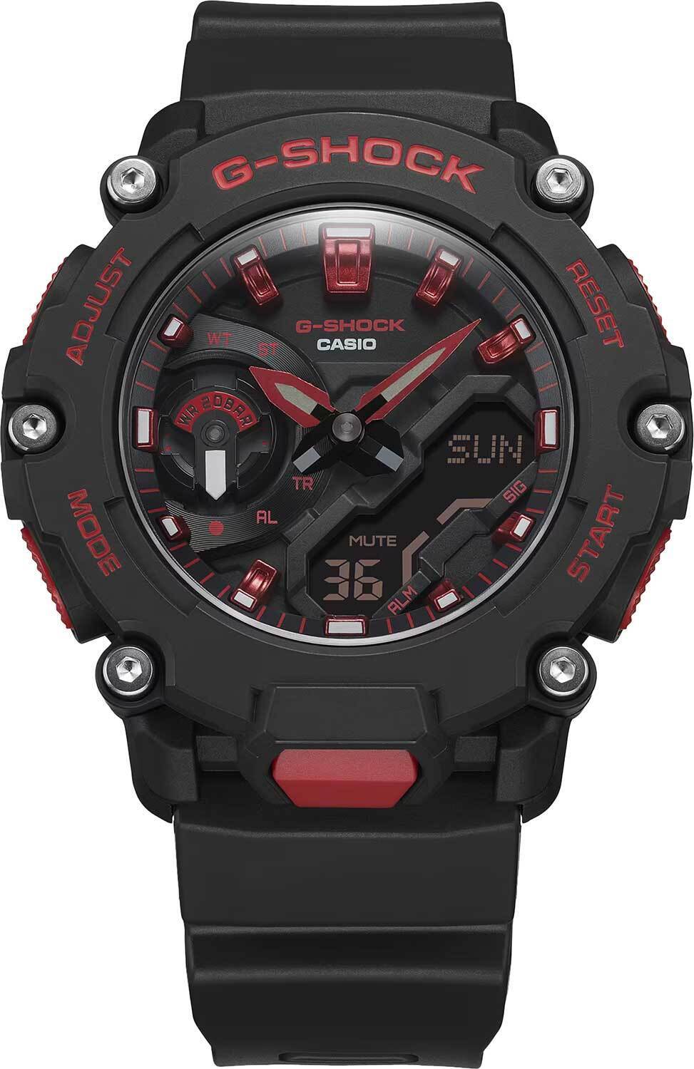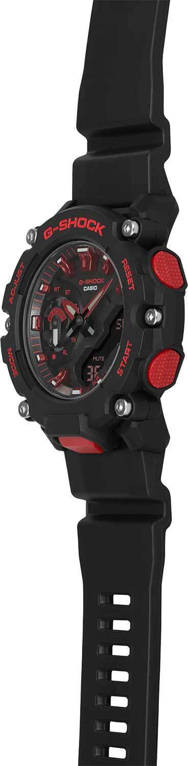 Мужские кварцевые аналого-цифровые наручные часы. Коллекция Casio G-Shock. Противоударный пластиковый корпус с углеродными волокнами (структура Carbon Core Guard) более прочный и, в то же время, более легкий, защищает внутренний модуль часов от повреждений и деформаций при ударах. Двойная светодиодная подсветка Super Illuminator обеспечивает подсветку не только аналогового циферблата, но и цифрового дисплея, настройка продолжительности подсветки 1,5 или 3 секунды, послесвечение. Необритовое светонакопительное покрытие стрелок обеспечивает длительное послесвечение в темноте после кратковременного воздействия света. 12-ти и 24-х часовой формат отображения времени. Секундомер с точностью показаний 1/100 секунды (первый час) и 1 секунда (после первого часа) и временем измерения 24ч. Режимы измерения: прошедшее время, промежуточное время, два финишных результата. Таймер обратного отсчета от 1с до 24ч (с интервалом в 1 секунду), 10-секундный сигнал об окончании обратного отсчета. Мировое время – 48 городов (31 часовой пояс), всемирное координированное время (UTC). Функция включения/отключения летнего времени. Переключение между домашним и мировым временем. Автоматический календарь до 2099 г. 5 ежедневных будильников, сигнал начала часа, продолжительность звучания сигнала 10 секунд. Функция отключения/включения звука кнопок. Функция перемещения стрелок для удобного просмотра информации на цифровом экране. Усиленный углеродными волокнами пластиковый корпус чёрного цвета. Размеры корпуса 47,1 мм на 50,8мм, толщина 12,8мм. Чёрный циферблат с ярко-красными стрелками и часовыми метками. Устойчивое к мелким механическим повреждениям минеральное стекло. Стальная задняя крышка. Чёрный пластиковый ремешок с классической застежкой buckle. . Батарея рассчитана на 3 года. Водонепроницаемость 200 WR (плавание и ныряние без акваланга). Вес около 57 г.