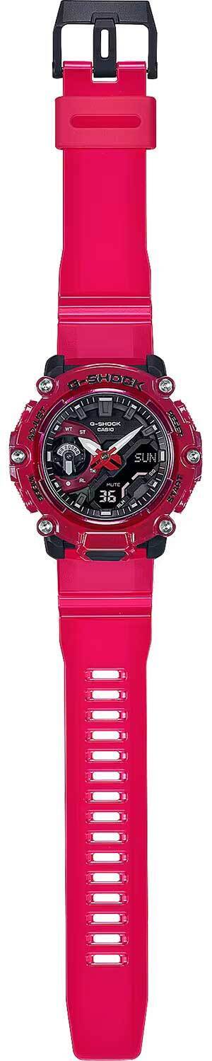 Мужские кварцевые аналого-цифровые наручные часы. Коллекция Casio G-Shock. Противоударный пластиковый корпус с углеродными волокнами (структура Carbon Core Guard) более прочный и, в то же время, более легкий, защищает внутренний модуль часов от повреждений и деформаций при ударах. Двойная светодиодная подсветка Super Illuminator обеспечивает подсветку не только аналогового циферблата, но и цифрового дисплея, настройка продолжительности подсветки 1,5 или 3 секунды, послесвечение. Необритовое светонакопительное покрытие стрелок обеспечивает длительное послесвечение в темноте после кратковременного воздействия света. 12-ти и 24-х часовой формат отображения времени. Секундомер с точностью показаний 1/100 секунды (первый час) и 1 секунда (после первого часа) и временем измерения 24ч. Режимы измерения: прошедшее время, промежуточное время, два финишных результата. Таймер обратного отсчета от 1с до 24ч (с интервалом в 1 секунду), 10-секундный сигнал об окончании обратного отсчета. Мировое время – 48 городов (31 часовой пояс), всемирное координированное время (UTC). Функция включения/отключения летнего времени. Переключение между домашним и мировым временем. Автоматический календарь до 2099 г. 5 ежедневных будильников, сигнал начала часа, продолжительность звучания сигнала 10 секунд. Функция отключения/включения звука кнопок. Функция перемещения стрелок для удобного просмотра информации на цифровом экране. Усиленный углеродными волокнами полупрозрачный пластиковый корпус красного цвета. Размеры корпуса 47,1 мм на 50,8мм, толщина 13,1мм. Чёрный циферблат с яркими красными элементами. Устойчивое к мелким механическим повреждениям минеральное стекло. Стальная задняя крышка. Крвсный полупрозрачный пластиковый ремешок с классической застежкой buckle. Батарея рассчитана на 3 года. Водонепроницаемость 200 WR (плавание и ныряние без акваланга). Вес около 57 г.