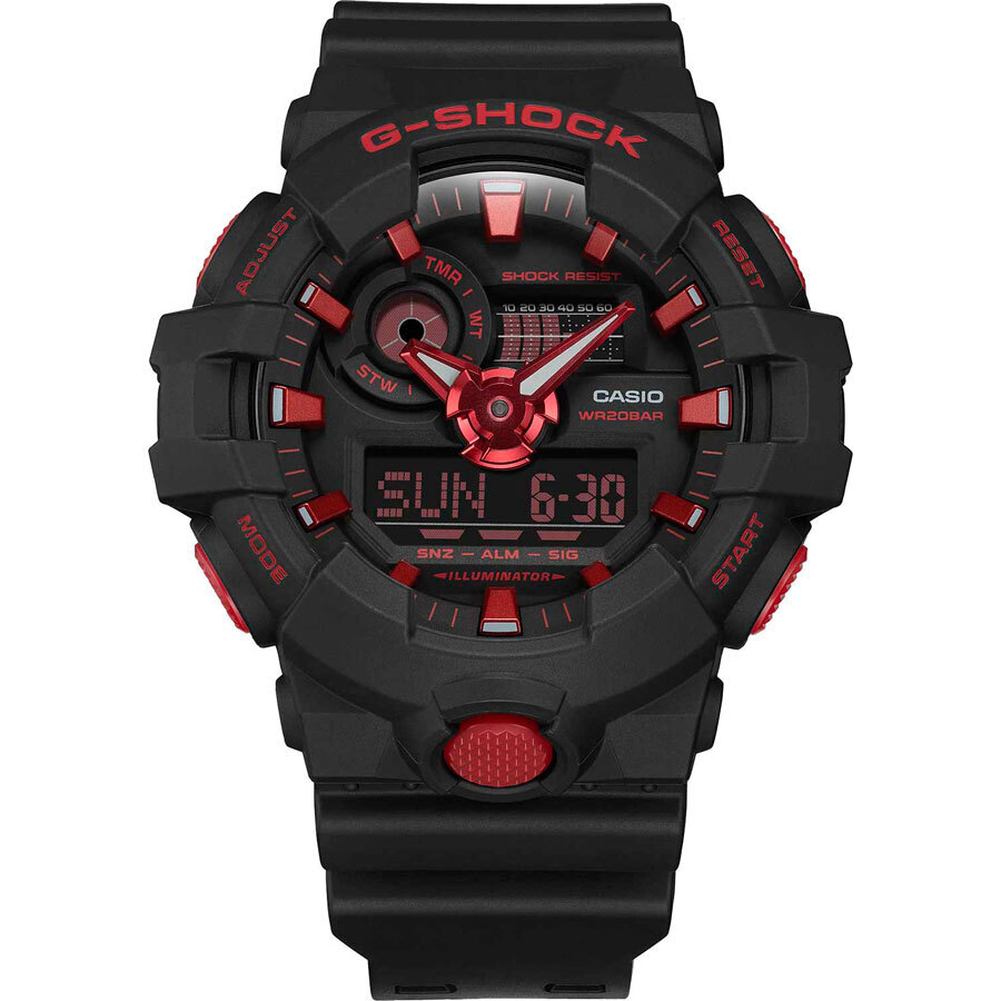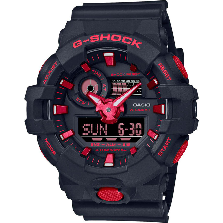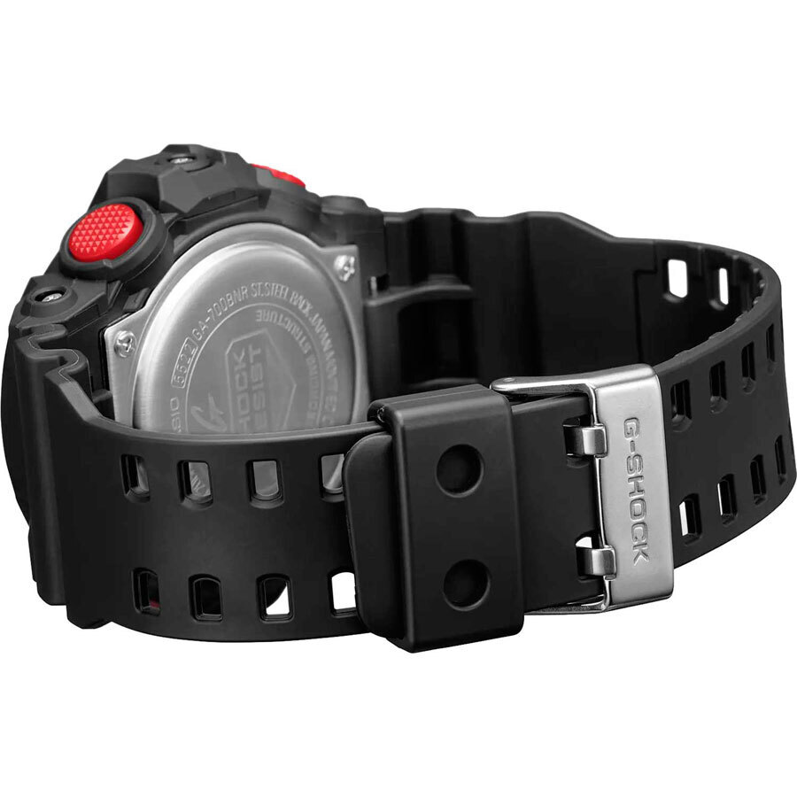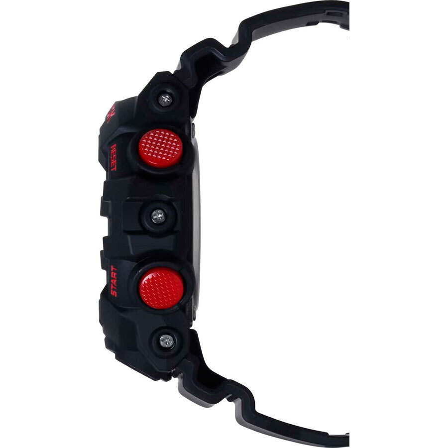 Мужские кварцевые аналого-цифровые наручные часы. Коллекция Casio G-Shock. Противоударный корпус защищает внутренний модуль часов от повреждений и деформаций при ударах. Cветодиодная подсветка, настройка продолжительности подсветки 1,5 или 3 секунды, послесвечение. Необритовое светонакопительное покрытие стрелок обеспечивает длительное послесвечение в темноте после кратковременного воздействия света. 12-ти и 24-х часовой формат отображения времени. Секундомер с точностью показаний 1/100 секунды и временем измерения 24 часа. Режимы измерения: прошедшее время, промежуточное время, два финишных результата, быстрое включение секундомера из режима Текущего времени. Таймер обратного отсчета от 1 мин до 60 мин (с интервалом в 1 минуту). Мировое время – 48 городов (31 часовой пояс), всемирное координированное время (UTC). Переключение между домашним и мировым временем. Функция включения/отключения летнего времени. Автоматический календарь до 2099 г. 5 ежедневных будильников (1 с повтором сигнала); сигнал начала часа. Функция отключения/включения звука кнопок. Функция перемещения стрелок. Круглый корпус из полимерного пластика чёрного цвета. Минеральное стекло устойчивое к мелким механическим повреждениям. Чёрный пластиковый ремешок с классической застежкой buckle. Батарея рассчитана на 5 лет. Водонепроницаемость 200 WR (плавание и ныряние без акваланга). Вес около 69 г.