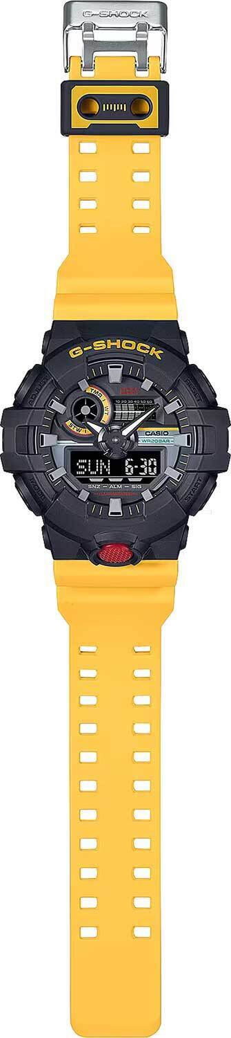 Мужские кварцевые аналогово-цифровые наручные часы. Серия Casio G-Shock MixTape. Дизайн часов вдохновлен красочными этикетками аудиокассет. Ударопрочная конструкция корпуса защищает механизм часов от ударов и вибрации. 12-ти и 24-х часовой формат отображения времени. Циферблат подсвечивается светодиодом, настройка продолжительности подсветки 1,5 или 3 секунды. Светящееся покрытие стрелок обеспечивает длительную подсветку в темное время суток после короткого воздействия света. Секундомер с точностью показаний 1/100 с и временем измерения 24 ч. Режимы измерения: прошедшее время, промежуточное время, два финишных результата; быстрое включение секундомера из режима Текущего времени. Таймер обратного отсчета от 1 мин до 1 ч (с интервалом в 1 минуту). Мировое время - 48 городов (31 часовой пояс), всемирное координированное время (UTC), включение/выключение перехода на летнее время, быстрая замена текущего времени на мировое. 5 ежедневных будильников (один с функцией повтора сигнала), ежечасный сигнал. Включение/выключение звука кнопок. Функция перемещения стрелок для удобного просмотра информации на цифровом экране. Автоматический календарь до 2099 года. Круглый корпус из полимерного пластика чёрного цвета. Размеры корпуса 53.4 мм на 57.5 мм, толщина 18.5 мм. Устойчивое к мелким механическим повреждениям минеральное стекло. Пластиковый ремешок жёлтого цвета со стандартной застёжкой Buckle. Примерный срок службы батарейки около 5 лет. Водозащищённость 200 WR (плавание и ныряние бкз акваланга). Вес около 69 г.