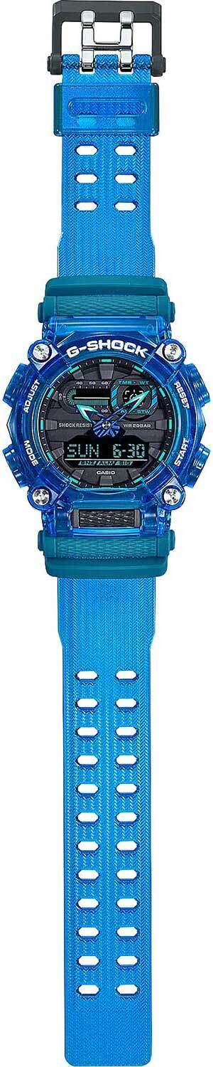 Мужские кварцевые аналогово-цифровые наручные часы. Коллекция Casio G-Shock . Противоударный корпус защищает внутренний модуль часов от повреждений и деформаций при ударах. Cветодиодная подсветка, настройка продолжительности подсветки 1,5 или 3 секунды, послесвечение. 12-ти и 24-х часовой формат отображения времени. Секундомер с точностью показаний 1/100 секунды и временем измерения 24 часа. Режимы измерения: прошедшее время, промежуточное время, два финишных результата, быстрое включение секундомера из режима Текущего времени. Таймер обратного отсчета от 1 мин до 60 мин (с интервалом в 1 минуту). Мировое время – 48 городов (31 часовой пояс), всемирное координированное время (UTC). Переключение между домашним и мировым временем. Функция включения/отключения летнего времени. Автоматический календарь до 2099 г. 5 ежедневных будильников (1 с повтором сигнала); сигнал начала часа. Функция отключения/включения звука кнопок. Функция перемещения стрелок для удобного просмотра информации на цифровом экране. Круглый корпус из полупрозрачного пластика синего цвета. Размеры корпуса 49,5 мм на 52,8мм, толщина 16,9мм. Минеральное стекло устойчивое к мелким механическим повреждениям. Пластиковый ремешок синего цвета с классической застежкой buckle. Батарея рассчитана на 7 лет. Водонепроницаемость 200 WR (плавание и ныряние без акваланга). Вес около 65 г.