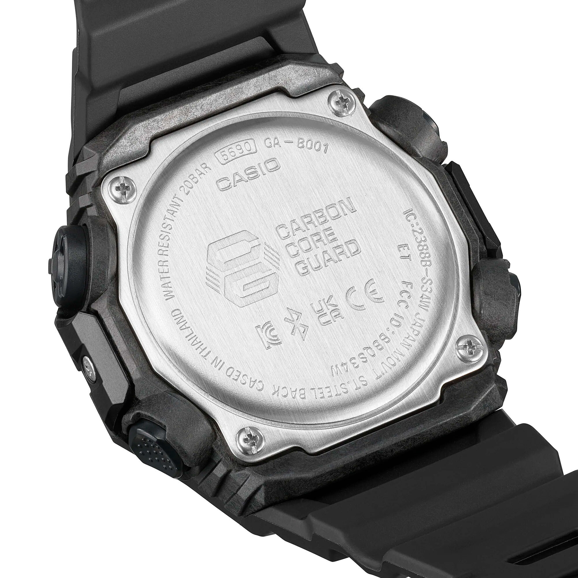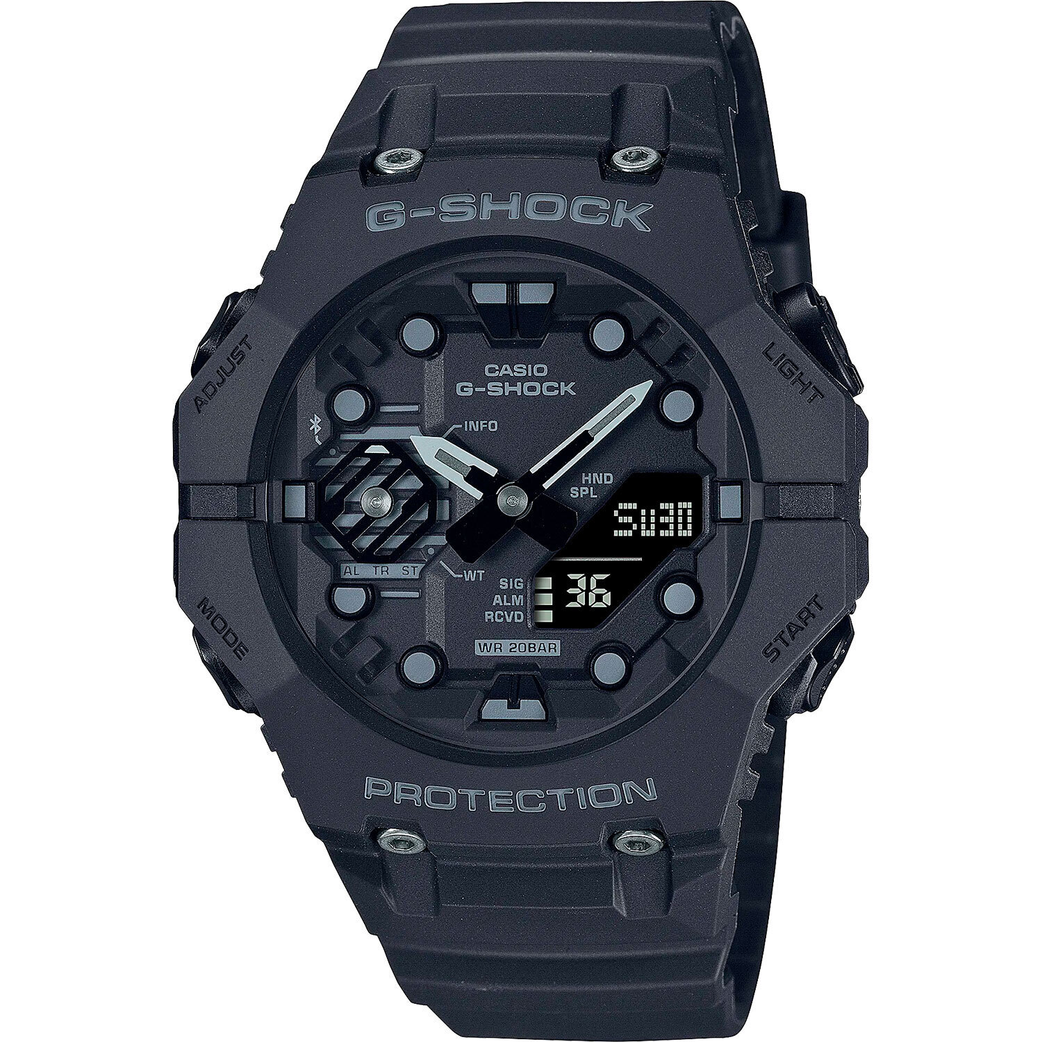 Мужские кварцевые аналогово-цифровые наручные часы. Серия Casio G-Shock. Модель отличается уникальной конструкцией с двумя отдельными безелями, которые соединяются в положениях «9 часов» и «3 часа». Противоударный пластиковый корпус, усиленный углеродными волокнами (структура Carbon Core Guard), защищает внутренний модуль часов от повреждений и деформаций при ударах. Двойная светодиодная подсветка - освещается не только циферблат часов, но и цифровой дисплей, настройка продолжительности подсветки 1,5 или 3 с, послесвечение. Центральные часовая и минутная стрелки. Чёрный циферблат с часовыми метками в виде точек. Светящееся покрытие стрелок и часовых меток обеспечивает длительную подсветку в темное время суток после короткого воздействия света. 12-ти и 24-х часовой формат отображения времени. Секундомер с точностью измерения 1/100 секунды (в течение первого часа), 1 секунда (через 1 час) и временем измерения 24 часа. Режимы измерения: прошедшее время, время прохождения части дистанции, два финишных результата. Таймер обратного отсчета от 1 секунды до 24 часов (с интервалом в 1 секунду, с интервалом в 1 минуту и с интеравлом в 1 час). Мировое время – 38 городов (38 часовых поясов), всемирное координированное время (UTC), включения/отключения летнего времени, переключение между домашним и мировым временем. 5 ежедневных будильников, сигнал начала часа. Часы оснащены беспроводной технология Bluetooth® со сверхнизким потреблением энергии для синхронизации со смартфоном. При подключении к смартфону часы автоматически корректируют текущее время и получают доступ к целому ряду полезных функций. Автоматический календарь до 2099 года. Функция поиска телефона. Включение/отключение звука кнопок. Функция перемещения стрелок. Отображение дней недели на шести языках. Усиленный углеродными волокнами пластиковый корпус чёрного цвета. Размеры корпуса 42,5 мм х 46 мм, толщина 13,8 мм. Устойчивое к мелким механическим повреждениям минеральное стекло. Чёрный пластиковый ремешок со стандартной застёжкой Buckle. Примерный срок службы батареек около 2 лет. Водонепроницаемость 200WR (плавание и ныряние без акваланга). Вес около 51 г.