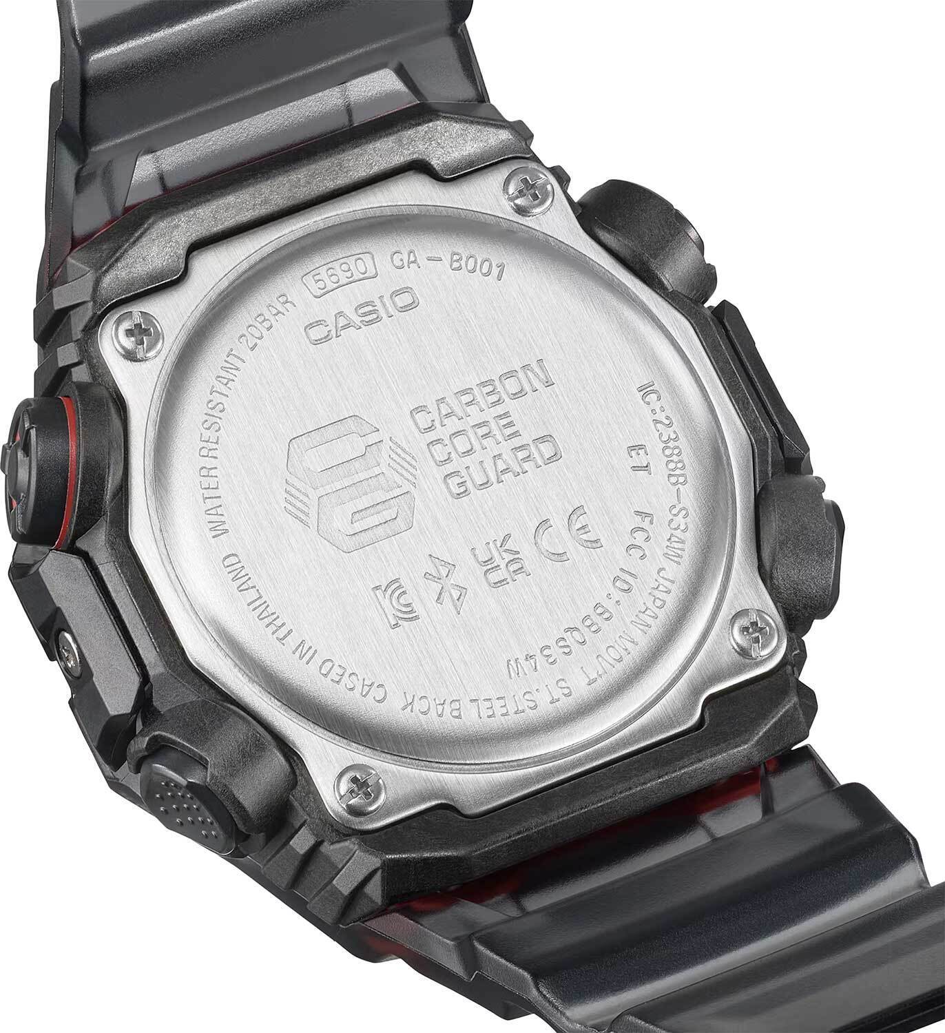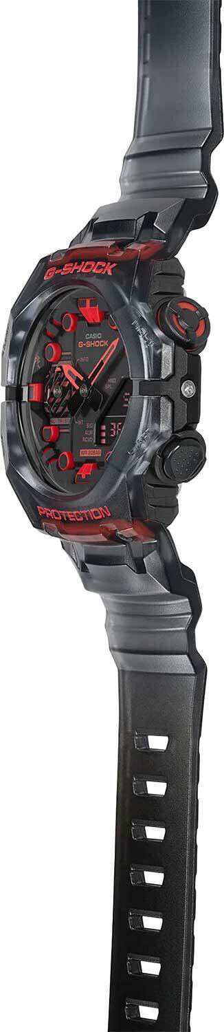 Мужские кварцевые аналогово-цифровые наручные часы. Серия Casio G-Shock. Модель отличается уникальной конструкцией с двумя отдельными безелями, которые соединяются в положениях «9 часов» и «3 часа». Противоударный пластиковый корпус, усиленный углеродными волокнами (структура Carbon Core Guard), более прочный и, в то же время, более легкий, защищает внутренний модуль часов от повреждений и деформаций при ударах. Двойная светодиодная подсветка - освещается не только циферблат часов, но и цифровой дисплей, настройка продолжительности подсветки 1,5 или 3 с, послесвечение. Центральные часовая и минутная стрелки. Чёрный циферблат с часовыми метками в виде точек. Светящееся покрытие стрелок и часовых меток обеспечивает длительную подсветку в темное время суток после короткого воздействия света. 12-ти и 24-х часовой формат отображения времени. Секундомер с точностью измерения 1/100 секунды (в течение первого часа) и 1 секунда (через 1 час) и временем измерения 24 часа. Режимы измерения: прошедшее время, время прохождения части дистанции, два финишных результата. Таймер обратного отсчета от 1 секунды до 24 часов (с интервалом в 1 секунду, с интервалом в 1 минуту и с интеравлом в 1 час). Сигнал оповещения об окончании обратного отсчета звучит в течение 10 секунд Мировое время – 38 городов (38 часовых поясов), всемирное координированное время (UTC), включения/отключения летнего времени, переключение между домашним и мировым временем. 5 ежедневных будильников, сигнал начала часа. Продолжительность звучания сигнала будильника 10 секунд. Часы оснащены беспроводной технология Bluetooth® со сверхнизким потреблением энергии для синхронизации со смартфоном. При подключении к смартфону часы автоматически корректируют текущее время и получают доступ к ряду полезных функций. Автоматический календарь до 2099 года. Функция поиска телефона. Включение/отключение звука кнопок. Функция перемещения стрелок для удобного просмотра информации на цифровом экране. Отображение дней недели на шести языках. Усиленный углеродными волокнами полупрозрачный пластиковый корпус чёрного цвета. Размеры корпуса 42,5 мм х 46 мм, толщина 13,8 мм. Устойчивое к мелким механическим повреждениям минеральное стекло. Чёрный полупрозрачный пластиковый ремешок со стандартной застёжкой Buckle. Примерный срок службы батареек около 2 лет. Водонепроницаемость 200WR (плавание и ныряние без акваланга). Вес около 51 г.