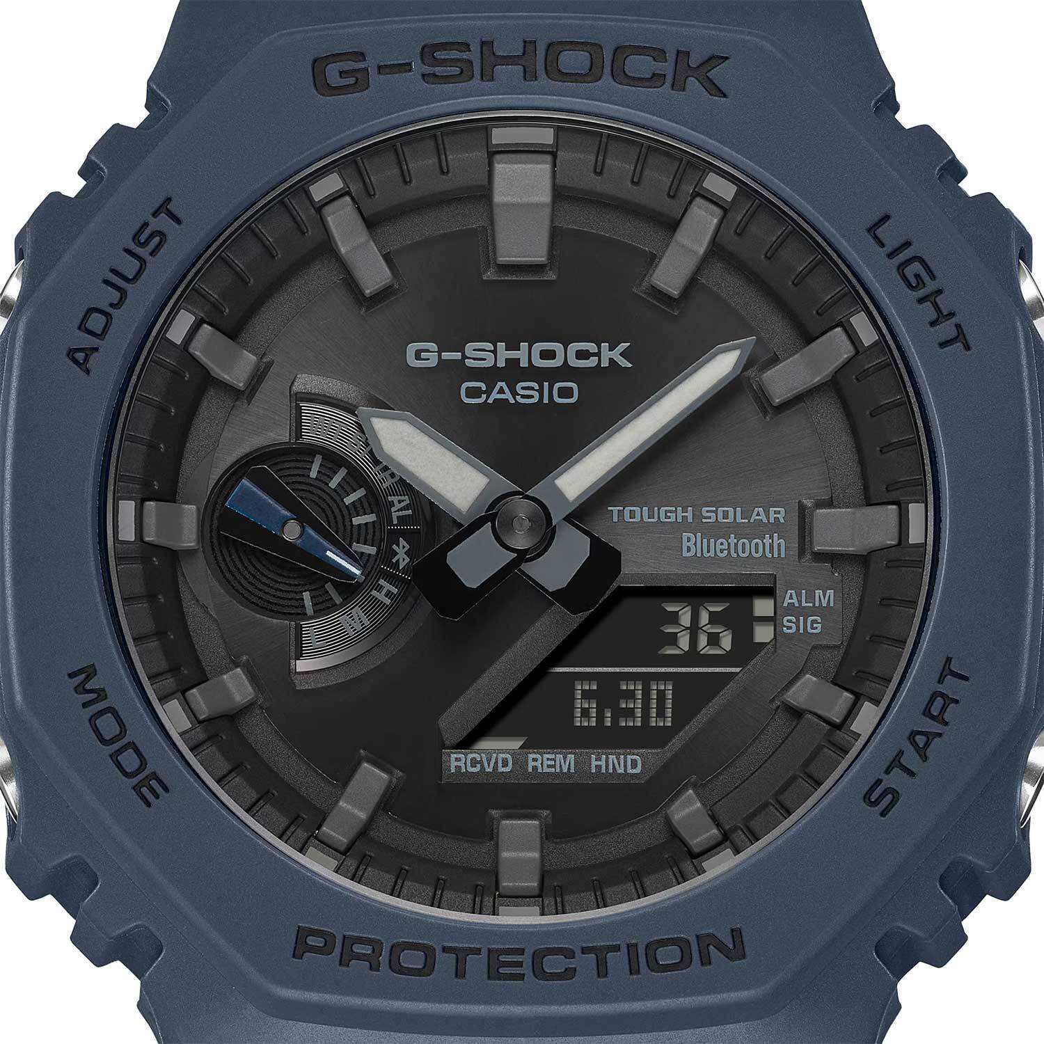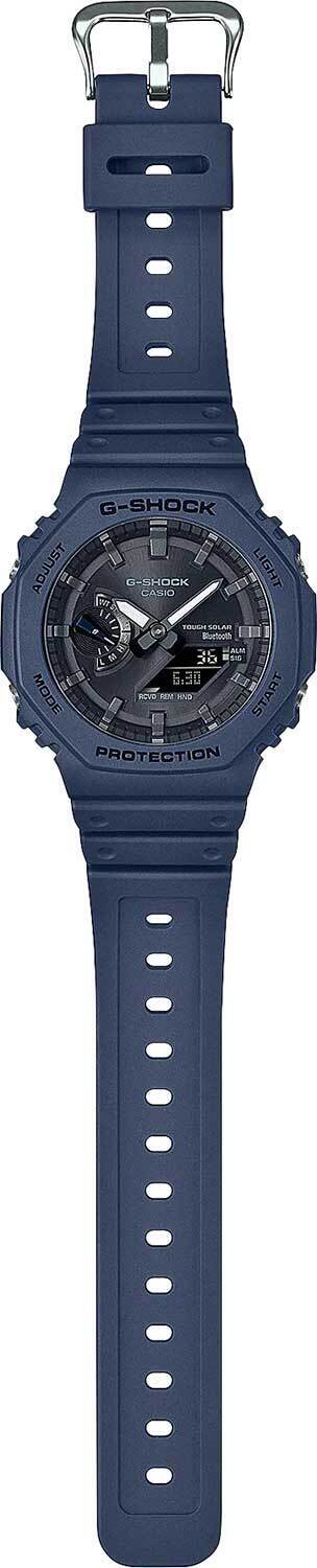 Мужские кварцевые аналогово-цифровые часы на солнечной батарее. Серия G-Shock. Противоударный пластиковый корпус с углеродными волокнами (структура Carbon Core Guard) более прочный и, в то же время, более легкий., защищает внутренний модуль часов от повреждений и деформаций при ударах и вибрации. Питание от солнечной энергии Tough Solar — источником питания служит светочувствительная панель и аккумулятор, который заряжается от солнечных лучей. Запас хода при полном заряде аккумулятора до 7 месяцев. Часы оснащены беспроводной технологией Bluetooth® со сверхнизким потреблением энергии для синхронизации со смартфоном. При подключении к смартфону часы автоматически корректируют текущее время и получают доступ к ряду полезных функций. Двойная светодиодная подсветка ( подсвичиваются циферблат и ЖК-дисплеи), послесвечение, настройка продолжительности подсветки 1,5 или 3 с. Секундомер с точностью измерения 1/100 секунды (в течение первого часа), 1 секунда (через 1 час) и временем измерения 24ч. Режимы измерения: прошедшее время, время прохождения части и круга дистанции. Таймер обратного отсчета от 1 секунды до 60 минут с интервалом в 1 секунду. Сигнал оповещения об окончании обратного отсчета звучит в течение 10 секунд. 5 ежедневных будильников, ежечасный сигнал. Продолжительность звучания сигнала будильника 10 секунд. Мировое время - 38 городов (38 часовых поясов), всемирное координированное время (UTC). Функция включения/отключения летнего времени. Переключение между домашним и мировым временем. 12-ти и 24-х часовой формат отображения времени. Автоматический календарь до 2099 г. Отображение дней недели на шести языках. Включение/выключение звука кнопок. Функция перемещения стрелок для удобного просмотра информации на цифровом экране. Индикатор заряда батареи. Функция сохранения энергии. Функция поиска телефона. Усиленный углеродными волокнами пластиковый корпус синего цвета. Размкры корпуса 48,6 мм на 45,5 мм, толщина 11,9 мм. Центральные часовая и минутная стрелки. Чёрный циферблат с часовыми метками в виде штрихов. Стрелки и метки с люминесцентным покрытием, которое светится в темноте после непродолжительного воздействия света. Минеральное стекло устойчивое к мелким механическим повреждениям. Ремешок из полимерного пластика синего цвета, стандартная застёжка Buckle. Водонепроницаемость 200WR (плавание и погружение без акваланга). Вес около 52 г.