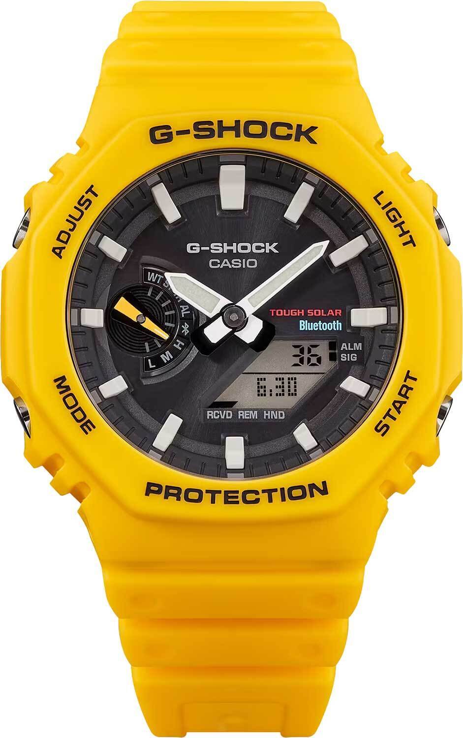 Мужские кварцевые аналогово-цифровые часы на солнечной батарее. Серия G-Shock. Противоударный пластиковый корпус с углеродными волокнами (структура Carbon Core Guard) защищает внутренний модуль часов от повреждений и деформаций при ударах и вибрации. Питание от солнечной энергии Tough Solar — источником питания служит светочувствительная панель и аккумулятор, который заряжается от солнечных лучей. Запас хода при полном заряде аккумулятора до 7 месяцев. Часы оснащены беспроводной технологией Bluetooth® со сверхнизким потреблением энергии для синхронизации со смартфоном. При подключении к смартфону часы автоматически корректируют текущее время и получают доступ к ряду полезных функций. Двойная светодиодная подсветка, послесвечение, настройка продолжительности подсветки 1,5 или 3 с. Секундомер с точностью измерения 1/100 секунды (в течение первого часа), 1 секунда (через 1 час) и временем измерения 24ч. Режимы измерения: прошедшее время, время прохождения части и круга дистанции. Таймер обратного отсчета от 1 секунды до 60 минут с интервалом в 1 секунду. 5 ежедневных будильников, ежечасный сигнал. Мировое время - 38 городов (38 часовых поясов), всемирное координированное время (UTC). Функция включения/отключения летнего времени. Переключение между домашним и мировым временем. 12-ти и 24-х часовой формат отображения времени. Автоматический календарь до 2099 г. Отображение дней недели на шести языках. Включение/выключение звука кнопок. Функция перемещения стрелок. Индикатор заряда батареи. Функция сохранения энергии. Функция поиска телефона. Усиленный углеродными волокнами пластиковый корпус жёлтого цвета. Размкры корпуса 48,5 мм на 45,4 мм, толщина 11,9 мм. Центральные часовая и минутная стрелки. Чёрный циферблат с часовыми метками в виде штрихов. Стрелки и метки с люминесцентным покрытием, которое светится в темноте после непродолжительного воздействия света. Минеральное стекло устойчивое к мелким механическим повреждениям. Ремешок из полимерного пластика жёлтого цвета, стандартная застёжка Buckle. Водонепроницаемость 200WR (плавание и погружение без акваланга). Вес около 52 г.