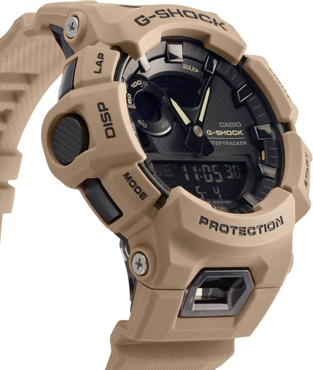 Мужские кварцевые аналогово-цифровые наручные часы. Серия Casio G-Shock G-Squad. Противоударный корпус защищает механизм часов от ударов и вибрации. Светодиодная автоматическая подсветка - при недостаточной освещенности поворот запястья включит подсветку часов. Настройка продолжительности подсветки 1,5 или 3 с. 12-ти и 24-х часовой формат отображения времени. Секундомер с точностью показаний 1/100 секунды (в течение первого часа), 1 секунда (через 1 час) и временем измерения 24 ч. Режимы измерения: прошедшее время, время прохождения круга и части дистанции, отображение на экране расстояния/темпа, автоматическое измерение времени прохождения круга/части дистанции, автоматическое оповещение о прохождении круга/части дистанции, сохранение в памяти до 45 результатов измерений. Таймер обратного отсчёта от 1 секунды до 60 минут с автоповтором, возможность установки до 5 таймеров. Количество повторений таймера от 1 до 20. Шагомер измеряет количество шагов от 0 до 999999 шагов. Звуковое напоминание об отсутствии активности и достижении цели. Функция расчета Lifelog - расчет калорий и расстояния на основе количества шагов. Мировое время. Одновременное отображение текущего времени в двух разных часовых поясах. 5 ежедневных будильников, ежечасный сигнал. Часы оснащены беспроводной технологией Bluetooth® со сверхнизким потреблением энергии для синхронизации со смартфоном. При подключении к смартфону часы автоматически корректируют текущее время и получают доступ к ряду функций. Функция перемещения стрелок для удобного просмотра информации на цифровом экране. Функция отключения/включения звука кнопок. Функция поиска телефона. Уведомление о входящих вызовах. Авиарежим позволяет отключить радио- и GPS-приемник на время перелета. Предупреждение о низком уровне заряда аккумуляторной батареи. Автоматический календарь до 2099 года. Круглый корпус из полимерного пластика бежевого цвета. Размеры корпуса 48,9 мм на 51,3мм, толщина 16,6мм. Чёрный циферблат с часовыми метками в виде штрихов. Центральные часовая и минутная стрелки. Стрелки с люминесцентным покрытием, которое светится в темноте после непродолжительного воздействия света. Устойчивое к мелким механическим повреждениям минеральное стекло. Бежевый пластиковый ремешок с классической застёжкой buckle. Батарея рассчитана на 2 года. Водонепроницаемость 200WR (плавание и погружение без акваланга). Вес около 61 г.