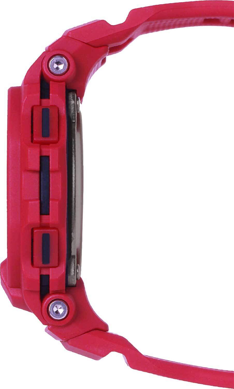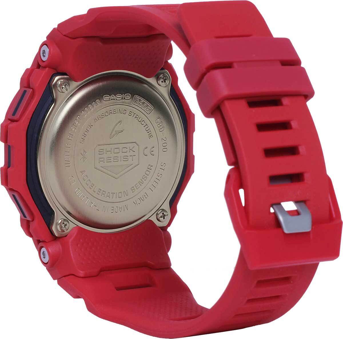 Мужские кварцевые электронные наручные часы. Серия Casio G-Shock G-Squad. Противоударный корпус защищает механизм часов от ударов и вибрации. Часы оснащены беспроводной технологией Bluetooth® со сверхнизким потреблением энергии для синхронизации со смартфоном. При подключении к смартфону часы корректируют текущее время, дату и мировое время и получают доступ к ряду полезных функций. Светодиодная автоматическая подсветка с выбираемой длительностью свечения 1,5 или 3 секунды. Функция автоподсветки - при недостаточной освещенности поворот руки включит подсветку часов. Функция поиска телефона. Функция виброуведомлений. Функция энергосбережения -дисплей гаснет для экономии энергии на 3 часа каждый день. Шагомер (подсчет шагов с помощью 3-осевого акселерометра) - измеряет и отображает от 0 до 99 999 шагов. Акселерометр - датчик движения реагирует на ускорение, а затем отображает полученные данные на экране дисплея. Кроме того, датчик поддерживает функцию автоматического поворота часов, гарантируя, что изображение на экране всегда будет иметь нужную ориентацию. Журнал тренировки: до 100 записей, каждая из которых содержит до 140 результатов тренировки (прошедшее время, пройденная дистанция, скорость, темп, количество сожженных калорий). Анализ и планировщик тренировок. Авиарежим - часы переключаются в режим оффлайн нажатием кнопки. С помощью этой функции можно отключить радио- и GPS-приемник на время перелета. Cекундомер с точностью измерения 1 с временем измерения 100 часов. Режимы измерения: прошедшее время, промежуточное время. Память на 100 кругов. Таймер обратного отсчета от 1с до 1ч с автоповтором. Настройка времени работы 5 последовательных таймеров. Автоматический календарь до 2099 года. 12/24х часовой формат отображения времени. 4 ежедневных будильника, один с функцией повтора сигнала (Snooze). Мировчое время - 38 городов (38 часовых поясов), всемирное координированное время (UTC), включение/отключение летнего времени. Включение/выключение звука кнопок. Корпус из полимерного пластика красного цвета. Размеры корпуса 49,4 мм на 45,9мм, толщина 15мм. Устойчивое к мелким механическим повреждениям минеральное стекло. Красный пластиковый ремешок с классической застёжкой buckle. Примерный срок службы батарейки 2 года. Водозащита 200WR (плавание и погружение без акваланга). Вес около 58 г.