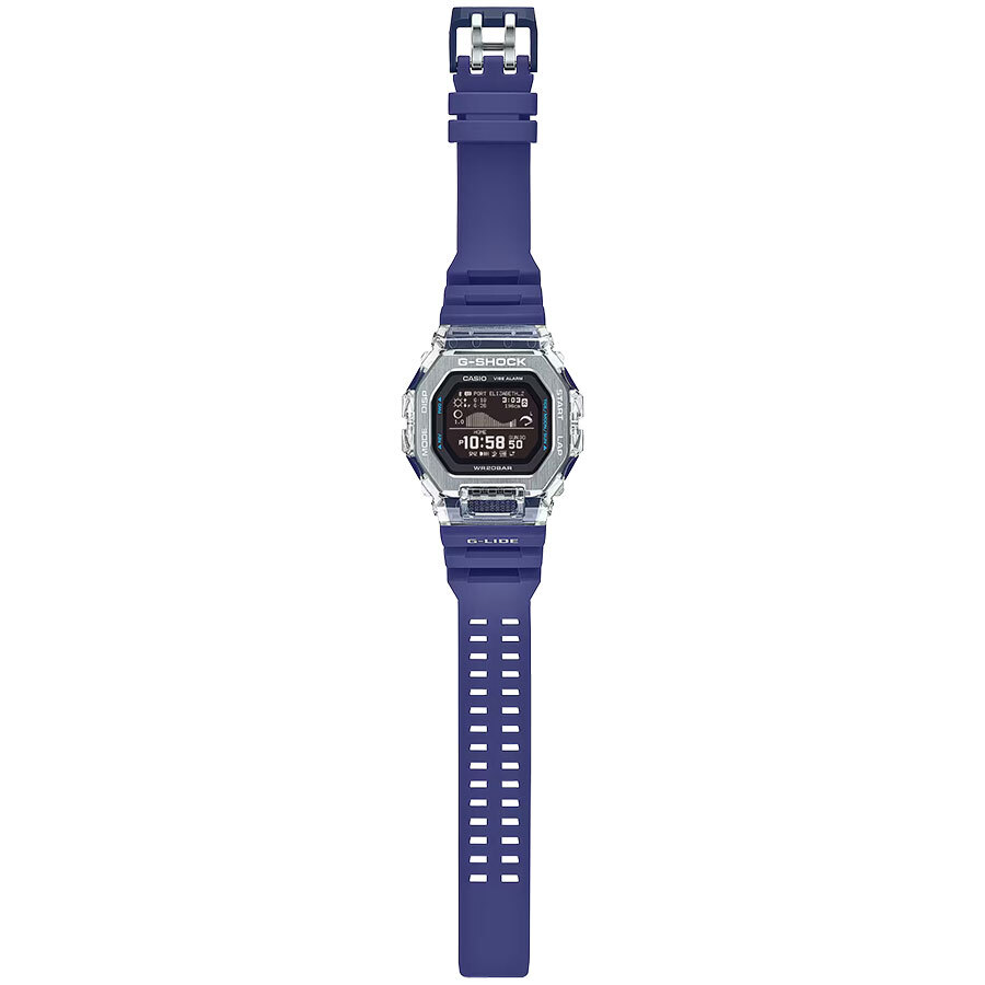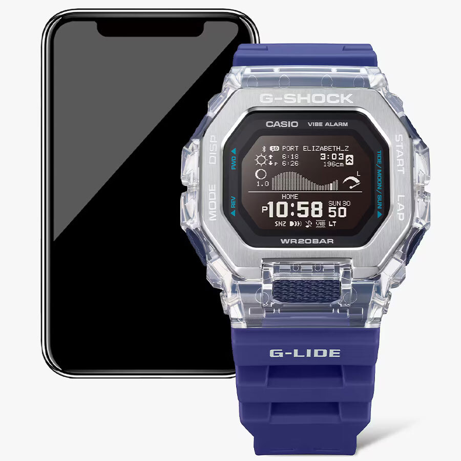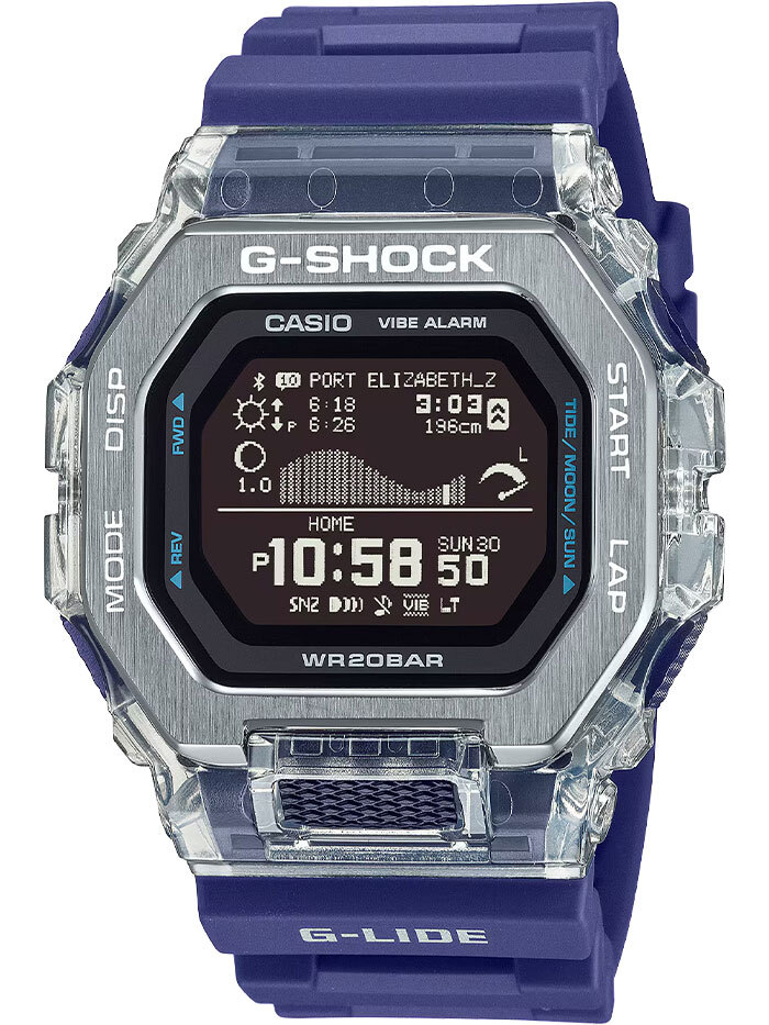 Мужские кварцевые электронные наручные часы. Серия Casio G-Shock. Противоударный корпус защищает механизм часов от ударов и вибрации. Светодиодная автоматическая подсветка -при недостаточной освещенности поворот руки включит яркую подсветку часов. Часы оснащены беспроводной технологией Bluetooth® со сверхнизким потреблением энергии для синхронизации со смартфоном. При подключении к смартфону часы корректируют текущее время, дату и мировое время. 12-ти и 24-х часовой формат отображения времени. Секундомер с точностью показаний 1с и временем измерения 100 ч. Режимы измерения: прошедшее время, промежуточное время. Возможность установить 5 последовательных таймеров. Таймер обратного отсчета от 1с до 1ч с автоповтором. Количество повторений таймера устанавливается от 1 до 20. Мировое время 38 городов (38 часовых поясов), всемирное координированное время (UTC). Автоматический переход на зимнее и летнее время, возможность включения/отключения данной функции. Функция тренировки отображает данные о расстоянии, скорости, темпе, сожженных калориях (до 100 пробежек, до 140 кругов за одну пробежку). Шагомер - диапазон измерения и отображения от 0 до 99 999 шагов. Функции вибро-уведомления, поиска телефона, настройки функции тренировки. Управление данными журнала тренировок. Акселерометр- отображение скорости. Отображение сведений о приливах и отливах. Время восхода и захода Солнца. 4 ежедневных будильника, один с функцией повтора сигнала Snooze. Автоматический календарь до 2099 года. Функция энергосбережения - дисплей гаснет для экономии энергии на 3 часа каждый день. Функция выключения звука нажатия кнопок (Mute). Прямоугольный корпус из полупрозрачного полимерного пластика. Размер корпуса 46 мм на 50,9мм, толщина 14,7мм. Стальной безель. Устойчивое к мелким механическим повреждениям минеральное стекло. Синий пластиковый ремешок с классической застёжкой buckle и прорезями, которые улучшают прилегание к запястью и позволяют воде или поту легко выходить наружу. Батарея рассчитана на 2 года. Водонепроницаемость 200WR (плавание и погружение без акваланга). Вес около 66 г.