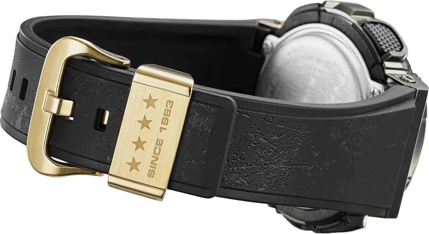 Мужские кварцевые наручные часы c аналого-цифровым отображением времени. Серия Casio G-Shock Limited. Модель выпущена ограниченной серией к 40-летию G-Shock - G-Shock 40th Anniversary Adventurer’s Stone. Вдохновением для дизайна часов послужили камни и различные минералы, которые использовали путешественники в средние века в качестве примитивного компаса. Противоударный корпус защищает механизм часов от ударов и вибрации. Часы созданы с защитой от воздействия магнитных полей. Автоматическая светодиодная подсветка — при недостаточном освещении поворот руки включает подсветку циферблата, выбор продолжительности подсветки 1,5 секунды или 3 секунды, послесвечение. Необритовое светонакопительное покрытие стрелок обеспечивает длительное послесвечение в темноте даже после кратковременного воздействия света. Мировое время – 48 городов (29 часовых поясов), всемирное координированное время (UTC). Автоматический переход на зимнее и летнее время, возможность включения/отключения данной функции. Переключение между домашним и мировым временем. 12-ти и 24-х часовой формат отображения времени. Секундомер с точностью показаний 1/100 с и временем измерения 1000 ч. Режимы измерения: прошедшее время, промежуточное время, два финишных результата. Таймер обратного отсчета от 1 мин до 24 ч (с интервалом в 1 минуту и с интервалом в 1 час) с автоповтором. 5 ежедневных будильников, один с функцией повтора сигнала (Snooze), ежечасный сигнал. Автоматический календарь до 2099 года. Круглый корпус из полимерного пластика. Размеры корпуса 48,8 мм на 51,9 мм, толщина 16,9 мм.. Безель из нержавеющей стали с IP покрытием. Устойчивое к мелким механическим поврежедениям минеральное стекло. Задняя крышка украшена логотипом, созданным граффити-художником Эриком Хейзом в ознаменование 40-летия G-Shock. Чёрный пластиковый ремешок с классической застежкой Buckle, на петле ремешка четыре звезды в честь 40-летия G-Shock. Батарейка рассчитана на 3 года. Водонепроницаемость 200 WR (плавание и ныряние без акваланга). Вес около 99 г.