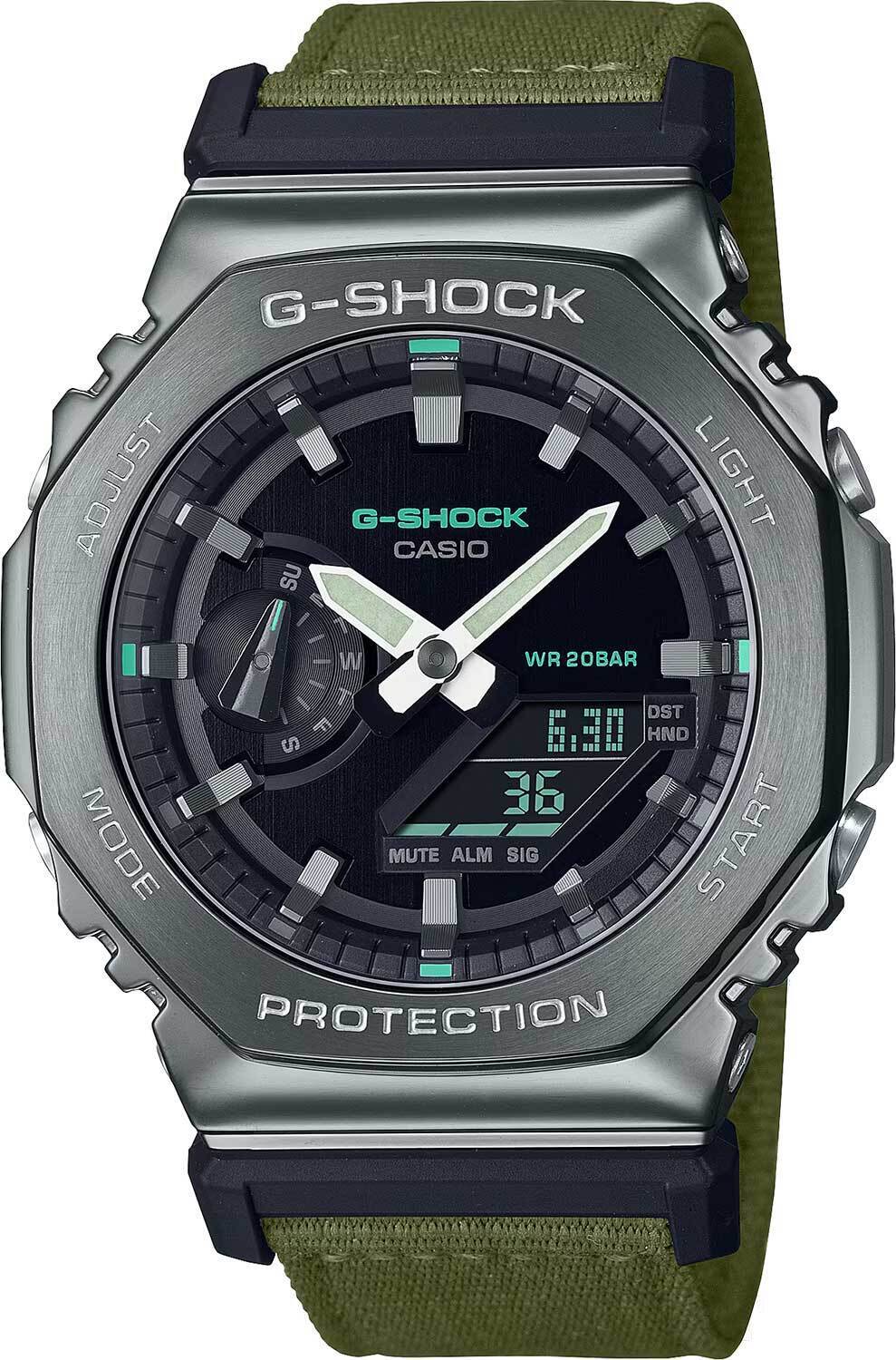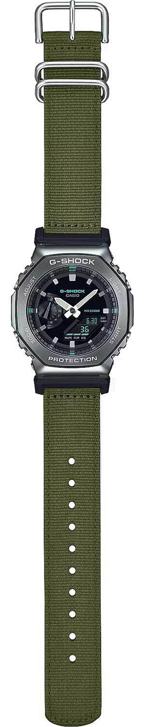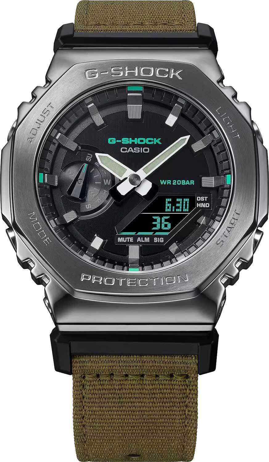 Мужские кварцевые аналогово-цифровые наручные часы. Серия G-Shock Utility Metal. Противоударный корпус из нержавеющей стали и полимерного пластика защищает механизм часов от ударов и вибраций. Двойная светодиодная подсветка обеспечивает подсветку не только цифрового дисплея, но и аналогового циферблата. Настройка продолжительности подсветки 1,5 или 3 секунды, послесвечение. Светящееся покрытие стрелок обеспечивает длительную подсветку в темное время суток после короткого воздействия света. 12-ти и 24-х часовой формат отображения времени. Секундомер с точностью показаний 1/100 с (первый час) и 1 с (после первого часа) и временем измерения 24 часа. Режимы измерения: прошедшее время, промежуточное время, два финишных результата. Таймер обратного отсчета от 1 секунды до 24 часов (с интервалом в 1 секунду) с автоповтором. Мировое время - 31 часовой пояс (48 городов), всемирное координированное время (UTC), включение/отключение летнего времени. 5 ежедневных будильников, ежечасный сигнал. Функция перемещения стрелок. Функция отключения/включения звука кнопок. Автоматический календарь до 2099 года. Стальной восьмиугольный корпус с покрытием серого цвета. Размер корпуса 44,4 мм на 49,3мм, толщина 11,8мм. Устойчивое к мелким механическим повреждениям минеральное стекло. Зелёный тканевый ремешок со стандартной застёжкой Buckle. Водонепроницаемость 200WR (плавание и ныряние без акваланга). Примерный срок службы батареи 3 года. Вес около 72 г.