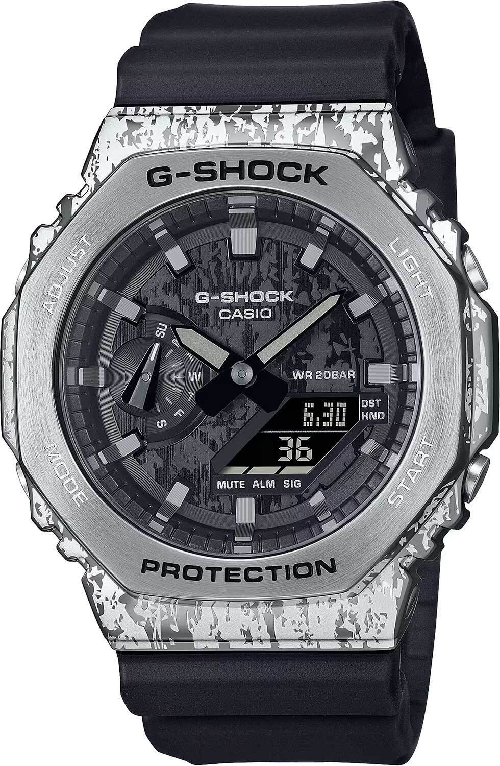 Мужские кварцевые аналогово-цифровые наручные часы. Серия G-Shock. Узор на корпусе, напоминающий облупившийся металл, вдохновлен культурой гранж-рока, которая была популярная в 90-х годах. Противоударный корпус из нержавеющей стали и полимерного пластика защищает механизм часов от ударов и вибраций. Двойная светодиодная подсветка обеспечивает подсветку не только цифрового дисплея, но и аналогового циферблата. Настройка продолжительности подсветки 1,5 или 3 секунды, послесвечение. Светящееся покрытие стрелок обеспечивает длительную подсветку в темное время суток после короткого воздействия света. Аналоговое отображение времени (центральные часовая и минутная стрелки). Электронные дата и день недели. 12-ти и 24-х часовой формат отображения времени. Секундомер с точностью показаний 1/100 с (первый час) и 1 с (после первого часа) и временем измерения 24 часа. Режимы измерения: прошедшее время, промежуточное время, два финишных результата. Таймер обратного отсчета от 1 секунды до 24 часов (с интервалом в 1 секунду) с автоповтором. Мировое время - 31 часовой пояс (48 городов), всемирное координированное время (UTC), включение/отключение летнего времени. 5 ежедневных будильников, ежечасный сигнал. Функция перемещения стрелок. Ретроградный указатель для недели. Функция отключения/включения звука кнопок. Автоматический календарь до 2099 года. Восьмиугольный корпус из нержавеющей стали и полимерного пластика серебристого цвета. Размер корпуса 44,4 мм на 49,3мм, толщина 11,8мм. Устойчивое к мелким механическим повреждениям минеральное стекло. Чёрный пластиковый ремешок со стандартной застёжкой Buckle. Примерный срок службы батареи 3 года. Водонепроницаемость 200WR (плавание и ныряние без акваланга). Вес около 72 г.