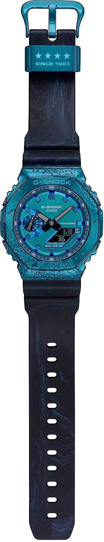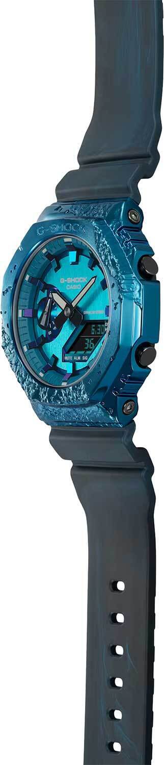 Мужские кварцевые наручные часы c аналогово-цифровым отображением времени. Серия Casio G-Shock Limited. Модель выпущена ограниченной серией к 40-летию G-Shock - G-Shock 40th Anniversary Adventurer’s Stone. Вдохновением для дизайна часов послужили камни и различные минералы, которые использовали путешественники в средние века в качестве примитивного компаса. Противоударный корпус защищает механизм часов от ударов и вибрации. Двойная светодиодная подсветка обеспечивает подсветку не только аналогового циферблата, но и цифрового дисплея, выбор продолжительности подсветки 1,5 секунды или 3 секунды, послесвечение. Необритовое светонакопительное покрытие стрелок обеспечивает длительное послесвечение в темноте даже после кратковременного воздействия света. Мировое время – 48 городов (31 часовой пояс), всемирное координированное время (UTC). Автоматический переход на зимнее и летнее время, возможность включения/отключения данной функции. 12-ти и 24-х часовой формат отображения времени. Секундомер с точностью показаний 1/100 с (первый час), 1 секунда (после первого часа) и временем измерения 24 ч. Режимы измерения: прошедшее время, промежуточное время, два финишных результата. Таймер обратного отсчета от 1 с до 24 ч (с интервалом в 1 секунду). 5 ежедневных будильников, сигнал начала часа. Функция перемещения стрелок. Автоматический календарь до 2099 года. Включение/выключение звука кнопок. Ретроградный стрелочный указатель для недели. Корпус из полимерного пластика синего цвета. Размеры корпуса 49,3 мм на 44,4 мм, толщина 12,1 мм.. Безель из нержавеющей стали с IP покрытием синего цвета. Устойчивое к мелким механическим поврежедениям минеральное стекло. Задняя крышка украшена логотипом, созданным граффити-художником Эриком Хейзом в ознаменование 40-летия G-Shock. Синий пластиковый ремешок с классической застежкой Buckle, на петле ремешка четыре звезды в честь 40-летия G-Shock. Батарейка рассчитана на 3 года. Водонепроницаемость 200 WR (плавание и ныряние без акваланга). Вес около 72 г.
