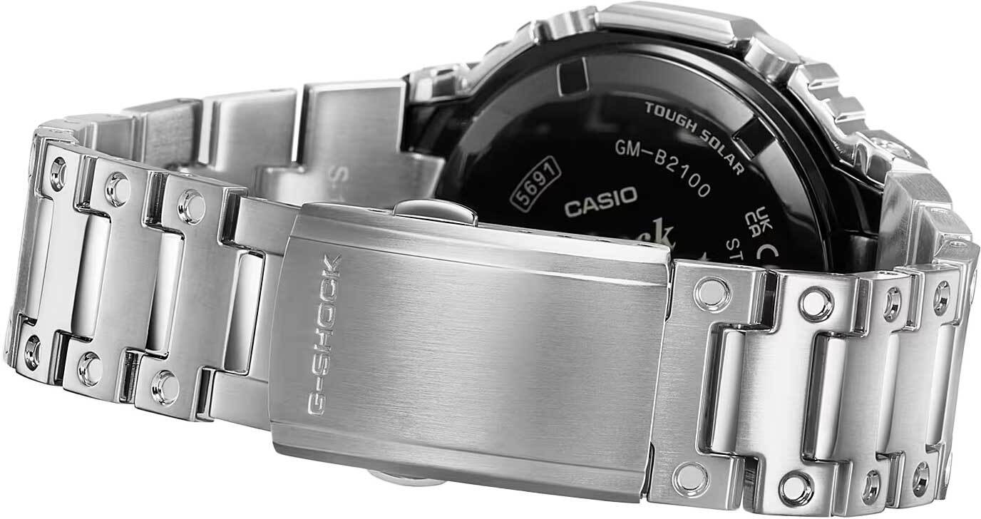 Мужские кварцевые аналого-цифровые наручные часы. Серия G-Shock. Противоударный корпус защищает механизм часов от ударов и вибрации. Питание от солнечной энергии (технология Tough Solar) - источником питания служит светочувствительная панель и аккумулятор, заряжаемый при попадании солнечного света на циферблат часов. Индикатор уровня заряда батареи. Функция автоматического сохранения энергии. Время работы аккумулятора без подзарядки около 7 месяцев, при включенной функции сохранения энергии около 18 месяцев. Двойная светодиодная подсветка обеспечивает подсветку не только аналогового циферблата, но и цифрового дисплея. Настраиваемое послесвечение 1,5 с или 3с, послесвечение. Необритовое светонакопительное покрытие стрелок обеспечивает длительное послесвечение в темноте даже после кратковременного воздействия света. 12-ти и 24-х часовой формат отображения времени. Секундомер с точностью показаний 1/100с (в течение первого часа) и 1с (через 1 час) и временем измерения 24ч. Режимы измерения: прошедшее время, время прохождения части и круга дистанции. Таймер обратного отсчета от 1с до 1часа с интервалом в 1 секунду. Мировое время – 38 городов (38 часовых поясов), всемирное координированное время (UTC). Автоматический переход на зимнее и летнее время, возможность включения/отключения данной функции, переключение между домашним и мировым временем. Часы оснащены беспроводной технологией Bluetooth® со сверхнизким потреблением энергии для синхронизации со смартфоном. При подключении к смартфону часы автоматически корректируют текущее время, в том числе переход на зимнее/летнее время, копируют настройки мирового времени более чем для 300 городов и позволяет получить доступ к ряду полезных функций часов. Функция поиска телефона. Функция отключения/включения звука кнопок. Функция перемещения стрелок для удобного просмотра информации на цифровых дисплеях. 5 ежедневных будильников, почасовой сигнал времени. Автоматический календарь до 2099 г, отображение дней недели на шести языках. Чёрный циферблат с часовыми метками в виде штрихов. Устойчивое к мелким механическим повреждениям минеральное стекло. Восьмиугольный корпус из нержавеющей стали. Размер корпуса 49,5 мм на 44,4 мм, толщина 12,8 мм. Завинчивающаяся задняя крышка. Браслет из нержавеющей стали с раскладывающейся тройной застежкой,. Водонепроницаемость 200WR (плавание и ныряние без акваланга). Вес около 165 г.