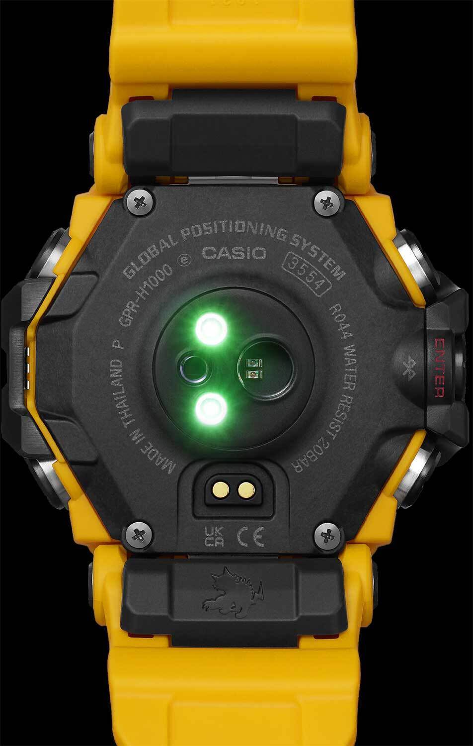 Мужские кварцевые электронные часы на солнечной батарее. Серия Rangeman Of G-Mudmaster. Противоударный корпус защищает механизм часов от ударов и вибрации. Защита от попадания внутрь пыли и грязи. Питание от солнечной энергии Tough Solar — источником питания служит светочувствительная панель и аккумулятор, подзаряжаемый от солнечного света; индикатор уровня заряда батареи. Возможность зарядки через специальный кабель с разъемом USB типа A. Функция автоматического сохранения энергии. Время работы аккумулятора без подзарядки от 14ч до 16ч (непрерывное использование GPS, датчика частоты сердечных сокращений), 19ч (кратковременное использование GPS, датчика частоты сердечных сокращений), 2 месяца (с выключенным измерением частоты пульса); при включенной функции сохранения энергии до 23 месяцев. Светодиодная автоматическая подсветка с выбираемой длительностью свечения 1,5 или 3 с. 12-ти и 24-х часовой формат отображения времени. Секундомер с точностью показаний 1с и временем измерения 100ч. Режимы измерения: прошедшее время, промежуточное время. Таймер обратного отсчета от 1с до 1ч с автоповтором. 4 ежедневных будильника с функцией повтора сигнала, почасовой сигнал времени. Умный будильник (с повтором). Автоматический календарь до 2099 года. Включение/выключение звука кнопок и виброоповещения. Мировое время – 38 городов (38 часовых поясов), всемирное координированное время (UTC). Автоматический переход на зимнее и летнее время, возможность включения/отключения данной функции. Функция включения/отключения летнего времени. Отображение возраста и фазы Луны. Время восхода и захода Солнца на конкретную дату. График приливов и отливов. Технология Smart Access. Мультиспорт (бег, трекинг, ходьба, езда на велосипеде, плавание и др.). Анализ тренировки: статус кардионагрузки. Данные журнала активности: до 100 пробежек по 200 кругов каждая, время измерения, расстояние, темп, индекс бега, сожженные калории, использованный источник энергии, частота пульса, кардионагрузка, шаг, количество ударов. Измерение частоты сердечного пульса (max 220 ударов в минуту), частота сердечных сокращений, графическая индикация зоны сердечного ритма, график сердечного ритма. Функция измерения уровня кислорода в крови. Измерение сна. Шагомер измеряет количество шагов от 0 до 999999 шагов. Устойчивость к низким температурам (-20 °C). Встроенный GPS датчик определяет точное время и местоположение. Барометр. Термометр (-10°C / +60°C). Цифровой компас. Высотометр 10 000 м. График набора высоты. Функция уведомлений (входящие звонки, входящие электронные письма, новые публикации в социальных сетях, уведомления календаря, напоминания). Функция поиска телефона. Авиарежим. Индикатор уровня заряда батарейки. Часы оснащены беспроводной технологией Bluetooth® со сверхнизким потреблением энергии для синхронизации со смартфоном. При подключении часов к смартфону часы корректирую текущее время и получают доступ к ряду полезных функций. Корпус из биопластика желтого цвета с защитной вставкой из кованной стали (в положении 9 ч) и вставкой, созданной методом литья под давлением металла (MIM) в позиции 3 ч. для защиты датчиков. Размер корпуса 60,6 x 53,2мм, толщина 20,3 мм. Жёлтый ремешок из биопластка, классическая застежка. На внутренней стороне ремешка изображение силуэта дикого кота RANGEMAN. Прочное минеральное стекло устойчивое к мелким механичес