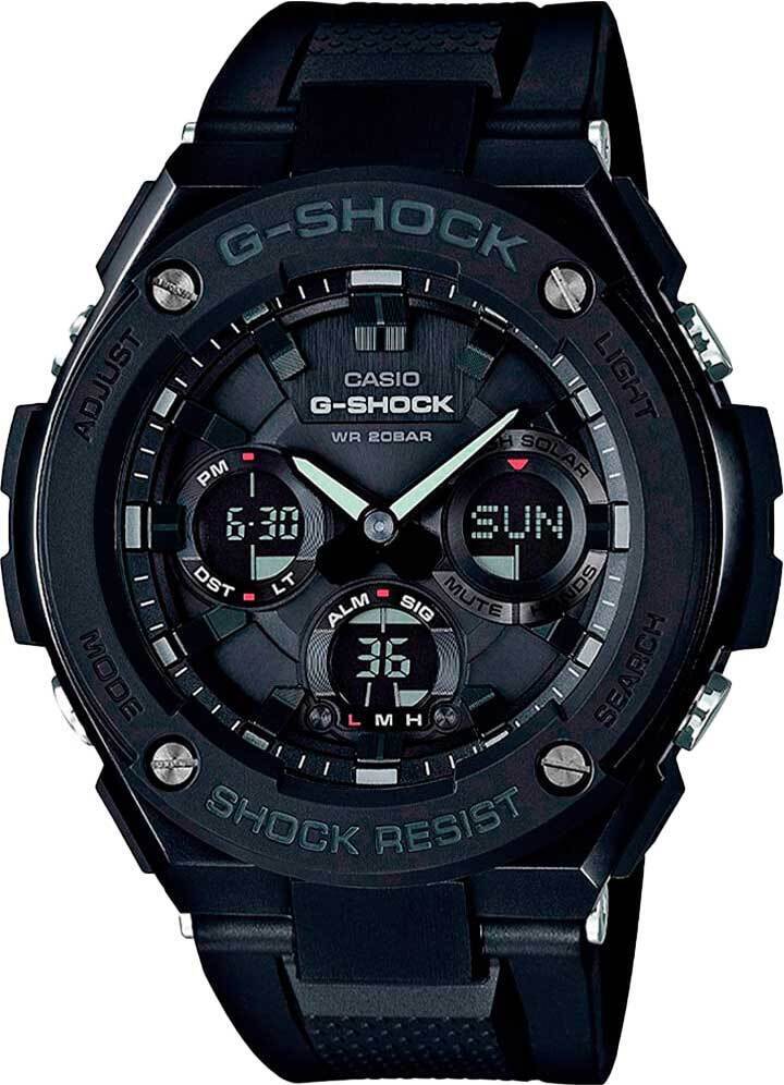 Мужские кварцевые аналого-цифровые наручные часы на солнечной батарее. Серия G-Shock G-Steel. Противоударный корпус защищает механизм часов от ударов и вибрации. Питание от солнечной энергии (технология Tough Solar) - источником питания служит светочувствительная панель и аккумулятор, подзаряжаемый при попадании солнечного света на циферблат часов. Индикатор уровня заряда батареи. Режим экономии энергии. Время работы аккумулятора без подзарядки приблизительно 8 месяцев, при включенной функции сохранения энергии приблизительно 19 месяцев. Двойная светодиодная подсветка обеспечивает подсветку не только аналогового циферблата, но и цифрового дисплея. Настраиваемое послесвечение 1,5 с или 3 с. Необритовое светонакопительное покрытие стрелок обеспечивает длительное послесвечение в темноте после кратковременного воздействия света. 12-ти и 24-х часовой формат отображения времени. Секундомер с точностью показаний 1/100 секунды и временем измерения 1ч. Режимы измерения: прошедшее время, промежуточное время, два финишных результата. Таймер обратного отсчета от 1 минуты до 100 минут (с интервалом в 1 секунду). Мировое время – 48 городов (31 часовой пояс), всемирное координированное время (UTC), автоматический переход на зимнее и летнее время, возможность включения/отключения данной функции, переключение между домашним и мировым временем. 5 ежедневных будильников, сигнал начала часа. Автоматический календарь до 2099 г. Включение/выключение звука кнопок. Функции перемещения стрелок для удобного просмотра информации на цифровом дисплее. Чёрный циферблат с метками в виде штрихов. Устойчивое к мелким механическим повреждениям минеральное стекло. Чёрный пластиковый ремешок с классической застежкой buckle. Водонепроницаемость 200 WR (плавание и ныряние без акваланга). Вес около 97 г.
