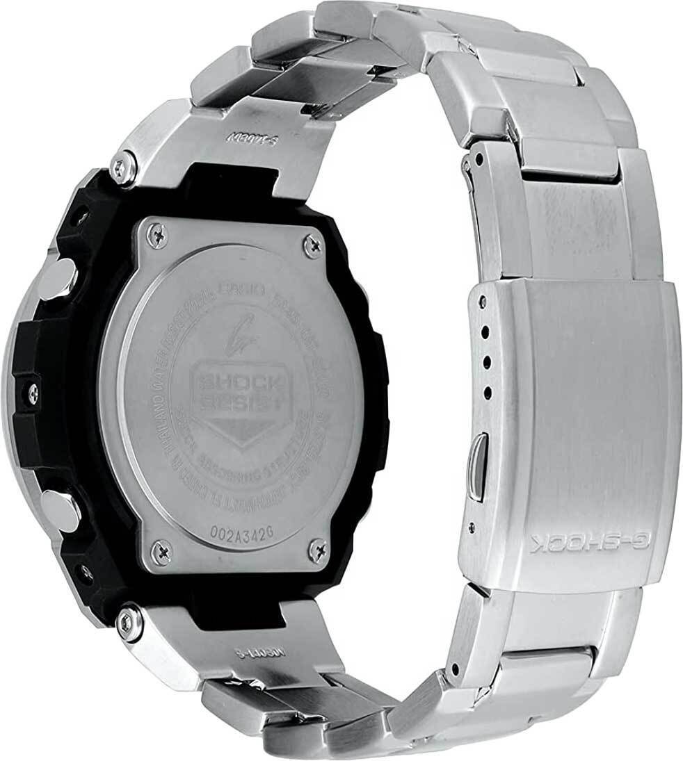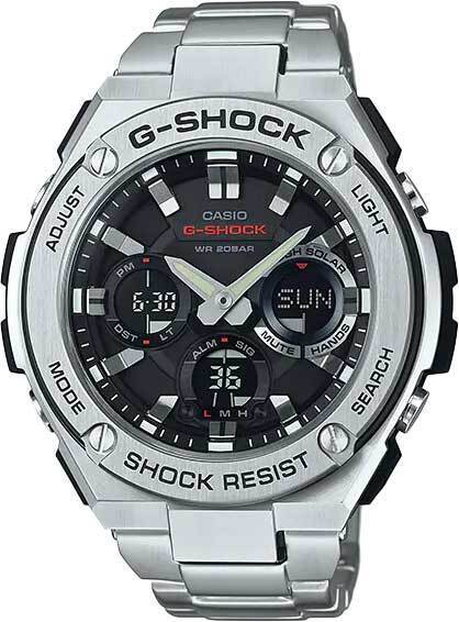 Мужские кварцевые аналогово-цифровые наручные часы. Серия Casio G-Shock G-Steel. Противоударный корпус защищает механизм часов от ударов и вибрации. Питание от солнечной энергии (технология Tough Solar) - источником питания служит светочувствительная панель и аккумулятор, подзаряжаемый при попадании солнечного света на лицевую поверхность часов. Индикатор низкого заряда батареи. Функция энергосбережения. Время работы без подзарядки в обычном режиме около 8 месяцев, в режиме энергосбережения приблизительно 19 месяцев. Двойная автоматическая светодиодная подсветка с возможностью выбора продолжительности освещения 1.5 или 3 секунды - одновременно подсвечивается аналоговый циферблат и цифровой дисплей. При недостаточном освещении поворот руки обеспечит автоматическое включение подсветки. Светонакопительное необритовое покрытие стрелок обеспечивает длительное послесвечение в темноте после кратковременного воздействия света. Таймер обратного отсчета от 1 минуты до 100 минут (с интервалом в 1 секунду). Мировое время - 31 часовая зона (48 городов), всемирное координированное время (UTC). Функция включения/отключения летнего времени. 12/24-х часовой формат отображения времени. Секундомер с точностью показаний 1/100 секунды и временем измерения 1 час. Режимы измерения: прошедшее время, промежуточное время, два финишных результата. 5 ежедневных будильников, ежечасный сигнал. Автоматический календарь до 2099 года. Функция включения/отключения звука кнопок. Функция перемещения стрелок. Круглый двухслойный корпус - между слоями стали, в качестве амортизирующей прокладки, выступает полимерный пластик. Размеры корпуса 52,4 мм на 59,1 мм, толщина 16,1 мм. Устойчивое к мелким механическим повреждениям минеральное стекло. Стальной браслет с раскладывающейся тройнаой застежкой. Водозащита 200WR (плавание и погружение без акваланга). Вес около 195 г.