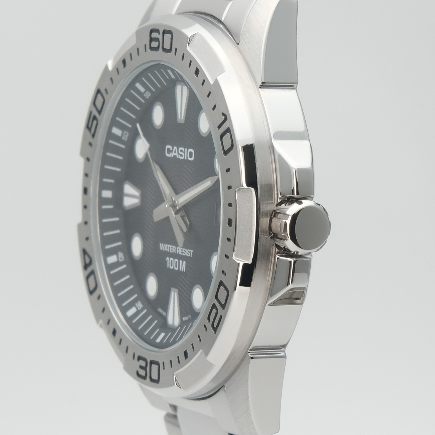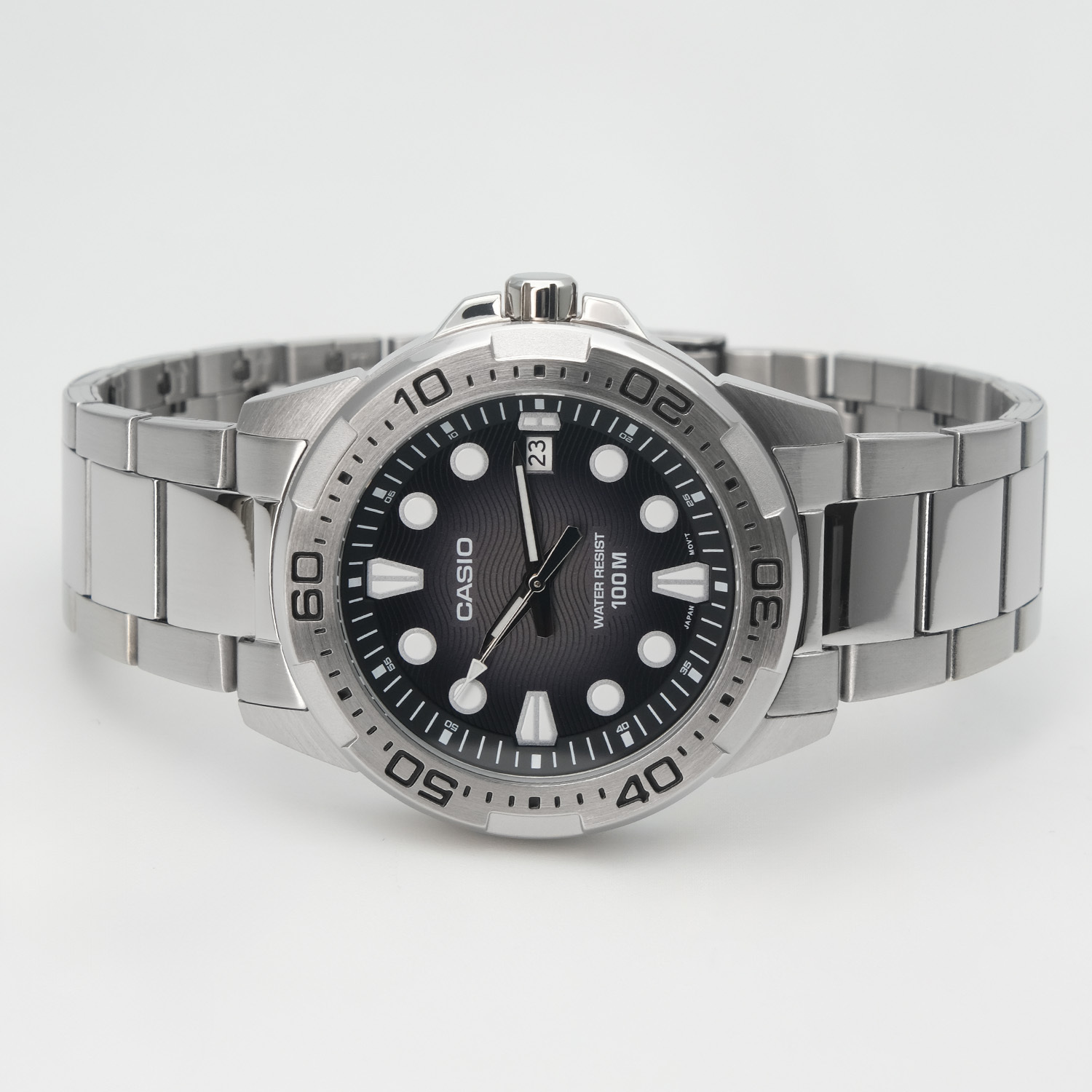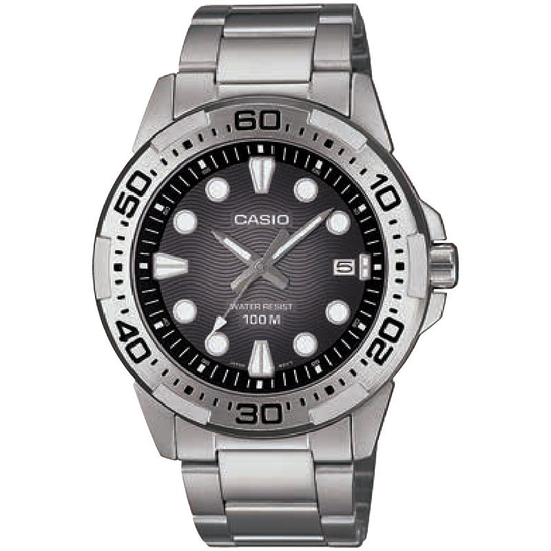 Мужские кварцевые наручные часы с аналоговым отображением времени. Серия Casio Collection. Центральные часовая, минутная и секундная стрелки. Чёрный циферблат с часовыми метками в виде штрихов и точек. Стрелки и метки с люминесцентным покрытием, которое светится в темноте после непродолжительного воздействия света. Индикация даты в позиции 3 часов (значение даты меняется до 31, для месяцев, у которых количество дней меньше 31, необходимо корректировать значение вручную). Устойчивое к мелким механическим повреждениям минеральное стекло. Круглый стальной корпус размером 43,7 мм на 48,4 мм, толщиной 9,5 мм. Минутная шкала на безеле. Переводная головка с защитой. Стальной браслет с тройной раскладывающейся застежкой. Батарейка рассчитана на 3 года. Водонепроницаемость 100WR (часы подходят для плавания с маской, трубкой и обычного плавания). Вес около 138 г.