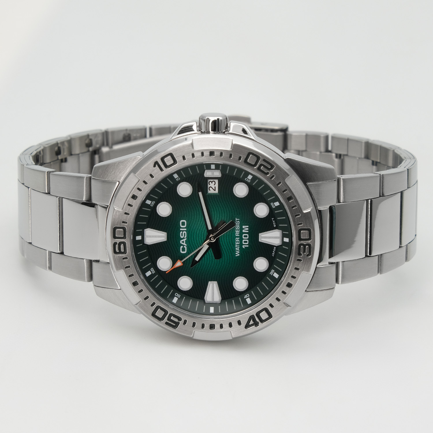 Мужские кварцевые наручные часы с аналоговым отображением времени. Серия Casio Collection. Центральные часовая, минутная и секундная стрелки. Зелёный циферблат с часовыми метками в виде штрихов и точек. Стрелки и метки с люминесцентным покрытием, которое светится в темноте после непродолжительного воздействия света. Индикация даты в позиции 3 часов (значение даты меняется до 31, для месяцев, у которых количество дней меньше 31, необходимо корректировать значение вручную). Устойчивое к мелким механическим повреждениям минеральное стекло. Круглый стальной корпус размером 43,7 мм на 48,4 мм, толщиной 9,5 мм. Минутная шкала на безеле. Переводная головка с защитой. Стальной браслет с тройной раскладывающейся застежкой. Батарейка рассчитана на 3 года. Водонепроницаемость 100WR (часы подходят для плавания с маской, трубкой и обычного плавания). Вес около 138 г.