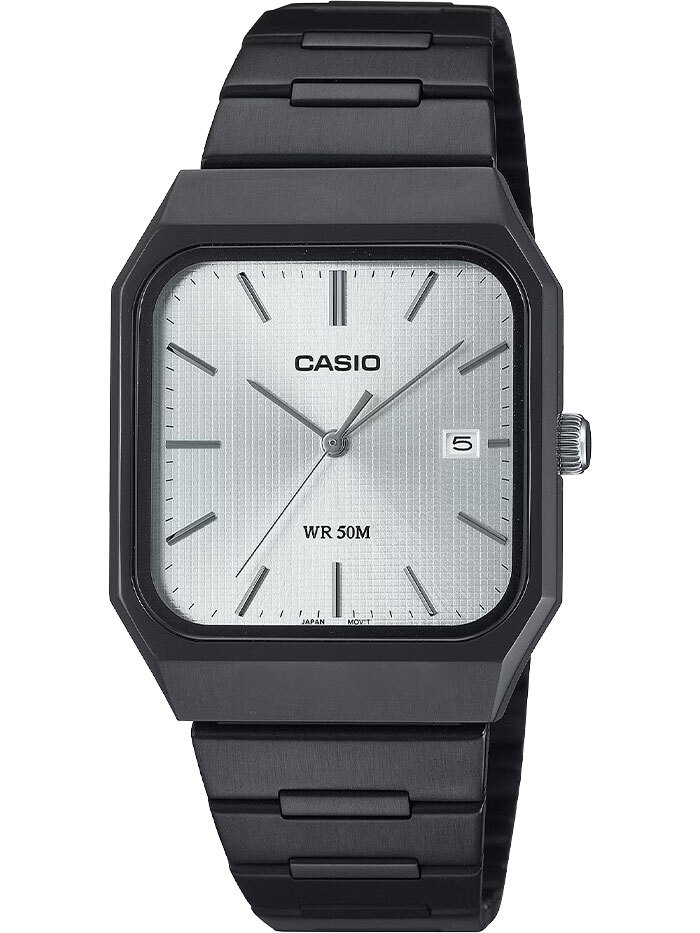 Мужские кварцевые часы с аналоговым отображением времени. Серия General Collection. Центральные часовая, минутная и секундная стрелки. Серебристый циферблат с часовыми метками в виде штрихов. Окошко даты в позиции 3 часов (значение даты меняется до 31, для месяцев, у которых количество дней меньше 31, необходимо корректировать значение вручную). Устойчивое к мелким механическим повреждениям минеральное стекло. Прямоугольный корпус из нержавеющей стали с чёрным IP покрытием. Размер корпуса 40 мм на 32,5 мм, толщина 7,3 мм. Рифлёная переводная головка. Стальной браслет с чёрным IP покрытием, раскладывающаяся застежка. Водонепроницаемость 50WR (мытьё рук, дождь). Вес около 80 г.