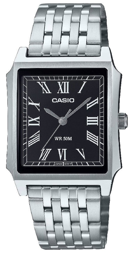Мужские кварцевые часы с аналоговым отображением времени. Серия General Collection. Центральные часовая, минутная и секундная стрелки. Чёрный циферблат с часовыми метками в виде римских цифр. Устойчивое к мелким механическим повреждениям минеральное стекло. Прямоугольный корпус из нержавеющей стали. Размер корпуса 41 мм на 31,5 мм, толщина 8,1 мм. Рифлёная переводная головка. Стальной браслет с раскладывающейся застежкой. Водонепроницаемость 50WR (мытьё рук, дождь). Вес около 97 г.