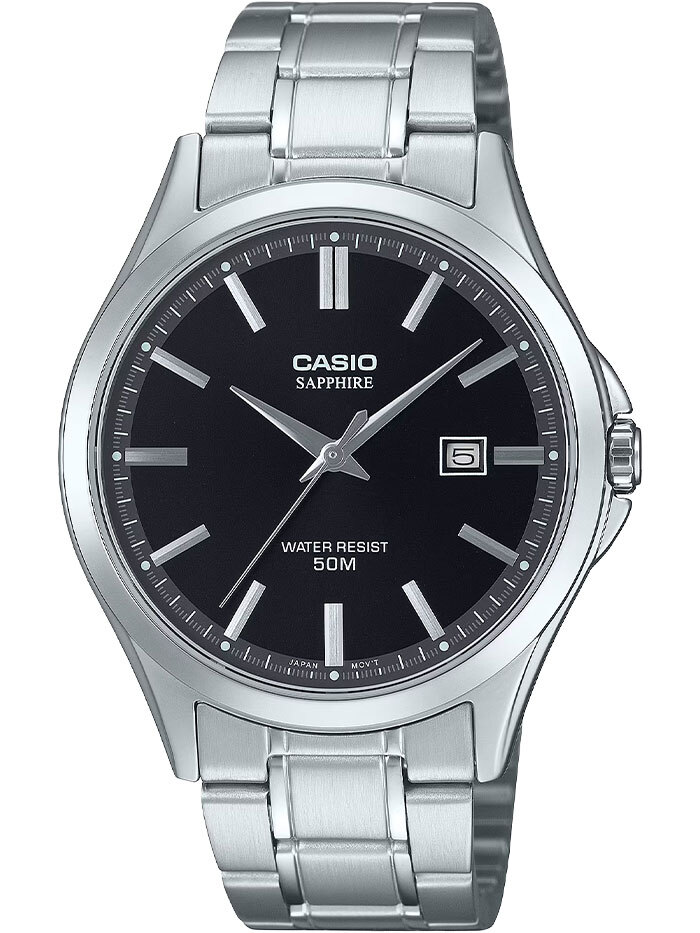 Мужские кварцевые часы с аналоговым отображением времени. Серия General Collection. Центральные часовая, минутная и секундная стрелки. Чёрный циферблат с часовыми метками в виде штрихов. Окошко даты в позиции 3 часов (значение даты меняется до 31, для месяцев, у которых количество дней меньше 31, необходимо корректировать значение вручную). Устойчивое к возникновению мелких царапин сапфировое. Круглый стальной корпус размером 47 мм на 41,3 мм, толщиной 8,8 мм. Рифлёная переводная головка с защитой. Стальной браслет с раскладывающейся застежкой. Батарейка рассчитана на 3 года. Водонепроницаемость 50WR (мытьё рук, дождь). Вес около 112 г.