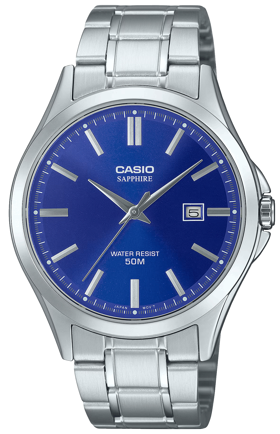 Мужские кварцевые часы с аналоговым отображением времени. Серия General Collection. Центральные часовая, минутная и секундная стрелки. Синий циферблат с часовыми метками в виде штрихов. Окошко даты в позиции 3 часов (значение даты меняется до 31, для месяцев, у которых количество дней меньше 31, необходимо корректировать значение вручную). Устойчивое к возникновению мелких царапин сапфировое. Круглый стальной корпус размером 47 мм на 41,3 мм, толщиной 8,8 мм. Рифлёная переводная головка с защитой. Стальной браслет с раскладывающейся застежкой. Батарейка рассчитана на 3 года. Водонепроницаемость 50WR (мытьё рук, дождь). Вес около 112 г.