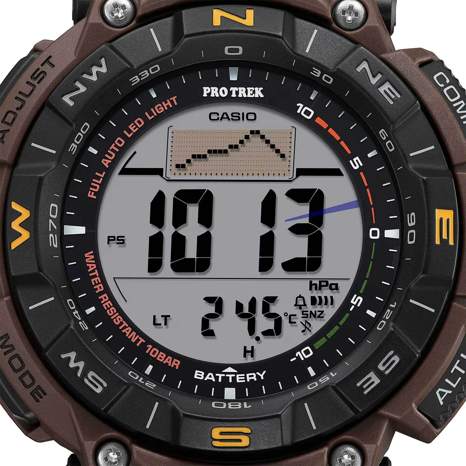 Мужские кварцевые электронные наручные часы. Серия Casio Pro-Trek. Полностью автоматическая светодиодная подсветка - поворот руки при недостаточном освещении обеспечит автоматическое включение подсветки дисплея. Питание от солнечной энергии Tough Solar - источником питания служит светочувствительная панель и аккумулятор, заряжаемый при попадании солнечного света на циферблат часов. Индикатор уровня заряда аккумулятора. Функция автоматического сохранения энергии. Время работы аккумулятора без подзарядки приблизительно 7 месяцев, при включенной функции сохранения энергии приблизительно 27 месяцев. Модуль часов рассчитан на работу при низких температурах до -10°С. Барометр (диапазон измерения и отображения от 260 гПа до 1.100 гПа) - специальный датчик измеряет давление воздуха и отображает измеренное значение на экране в виде символа. Единица измерения: 1 гПа, время измерения: ежедневно с полуночи, каждые 2 часа (12 раз в сутки); каждые 5 секунд в режиме Барометра/Термометра. Термометр (диапазон измерения и отображения: от-10°C до +60°C) -специальный датчик измеряет температуру окружающего воздуха вокруг часов и отображает ее на экране в градусах °C . Единица измерения: 0,1°C, время измерения: каждые 5 секунд в режиме Барометра/Термометра. Цифровой компас - диапазон измерения от 0° до 359°; единица измерения 1°; непрерывное измерение в течение 60 секунд; графический указателя направлений (север, юг, запад, восток); двунаправленная калибровка; коррекция угла магнитного склонения; записная книжка. Высотомер (альтиметр) - диапазон измерения от –700 м до 10 000 м - встроенный датчик давления определяет изменения в атмосферном давлении и преобразовывает полученные результаты в абсолютную высоту до 10 000 м. График изменения высоты. Память данных высотомера (хранение до 30 записей о высотных точках рельефа местности - измеренной абсолютной высоты, даты и времени). Данные о восходе/закате солнца - после введения географического местоположения, на экране будет отображаться восход и закат солнца для любой установленной даты. Функция мирового времени: 31 часовая зона (48 городов), всемирное координированное время (UTC), включение/выключение летнего времени. Секундомер с точностью показаний 1/10 секунды и временем измерения 1000 часов. Режимы измерения: прошедшее время, промежуточное время, два финишных результата. Таймер обратного отсчета от 1 минуты до 24 часов (с интервалом в 1 минуту и с интервалом в 1 час). 5 ежедневных будильников (один с функцией повтора сигнала), почасовой сигнал времени. Включение/выключение звука кнопок. Автоматический календарь до 2099 года. 12/24- х часовой формат отображения времени. Круглый корпус из биопластика (изготавливается из возобновляемых органических ресурсов). Размер корпуса 51,7мм на 54,7мм, толщина 15,1 мм. Вращающийся безель можно использовать для определения приблизительного направления. Устойчивое к мелким механическим повреждениям минеральное стекло. Двухслойный ЖК-дисплей позволяет одновременно отображать компас на верхнем слое, время или различные измерения на нижнем слое. ЖК-дисплей стал тоньше, удобное расположение кнопок позволяет управлять устройством в одно касание. Подвижная конструкция ушек позволяет полностью распрямить ремешок и разместить часы горизонтально на бумажной карте для удобства навигации. Коричневый кожаный реме