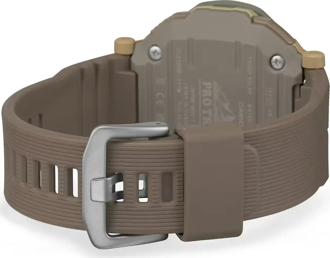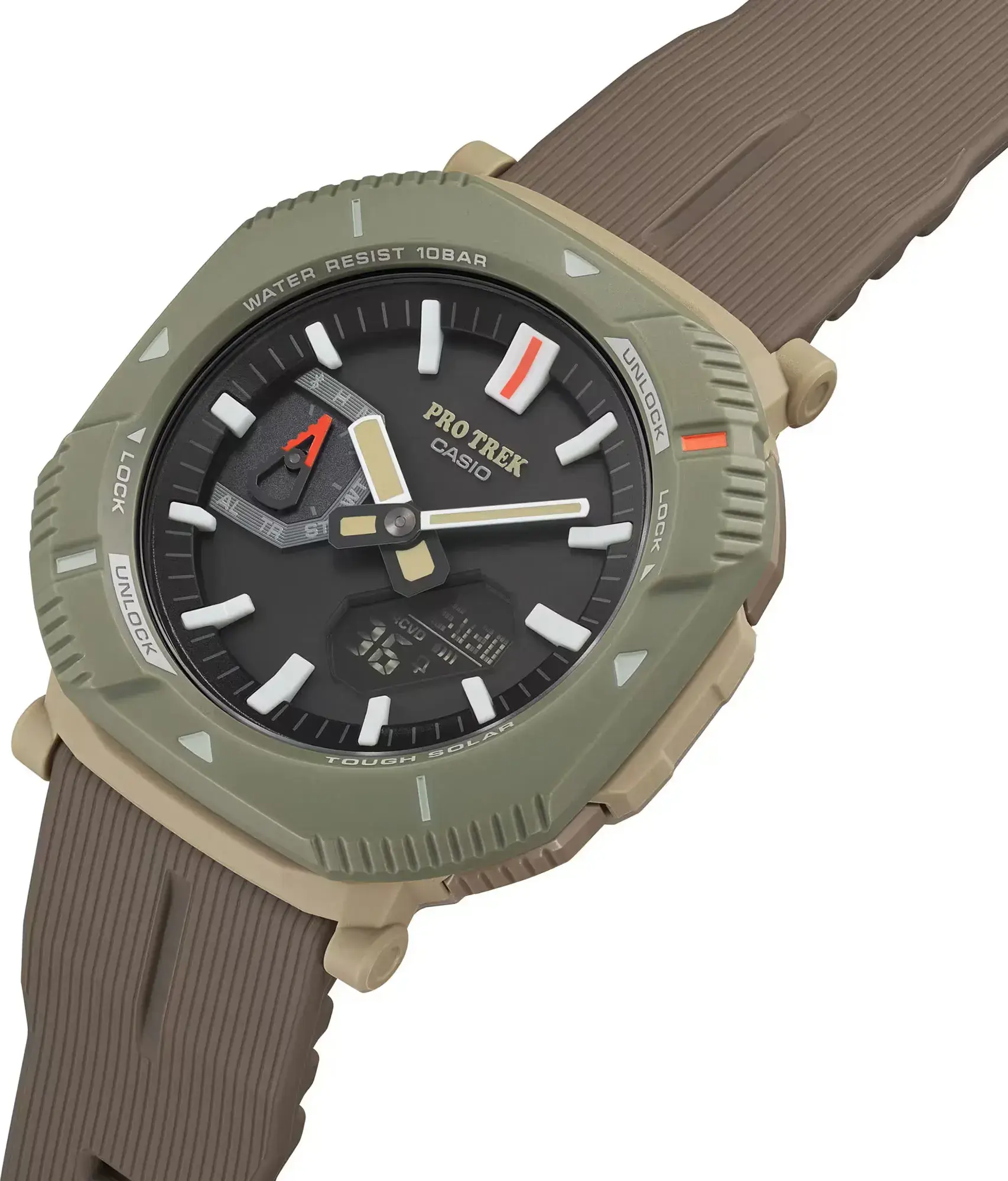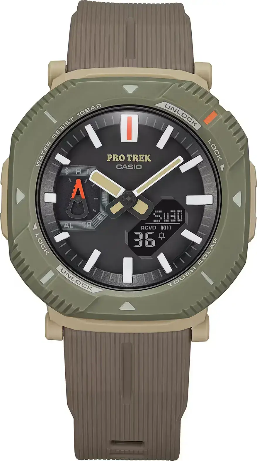 Мужские кварцевые аналого-цифровые наручные часы. Коллекция Casio ProTrek. Питание от солнечной энергии (технология Tough Solar) - источником питания служит светочувствительная панель и аккумулятор, подзаряжаемый при попадании солнечного света на циферблат часов. Индикатор уровня заряда батареи (стрелка индикатора на дополнительном малом циферблате в положении «9 часов» смоделирована по образцу карабина). Функция энергосбережения. Время работы без подзарядки в обычном режиме до 7 месяцев, в режиме энергосбережения до 18 месяцев. Часы оснащены беспроводной технологией Bluetooth® со сверхнизким потреблением энергии для синхронизации со смартфоном. При подключении к смартфону через специальное приложение, часы автоматически корректируют текущее время и получают доступ к ряду полезных функций. Двойная светодиодная подсветка Super Illuminator обеспечивает подсветку не только аналогового циферблата, но и цифрового дисплея, выбираемая продолжительность подсветки 1,5 или 3 секунды, послесвечение. Светонакопительное покрытие стрелок обеспечивает длительное послесвечение в темноте даже после кратковременного воздействия света. Часы устойчивы к низким температурам (до -10°С). Мировое время - 38 часовых зон (38 городов), всеобщее скоординированное время (UTC), возможность быстрого переключения между текущем временем и временем выбранной часовой зоны. Функция включения/отключения летнего времени. Секундомер с точностью показаний 1/100 секунды (первые 60 минут) и 1 секунда (через 60 минут) и временем измерения 24 ч. Режимы измерения: прошедшее время, время круга/промежуточное время. Таймер обратного отсчета от 1 секунды до 60 минут (1-секундное возрастание, 1-минутное возрастание). 5 ежедневных будильников, ежечасный сигнал. Автоматический календарь до 2099 года. 12/24х часовой формат отображения времени. Функция включения/отключения звука кнопок. Функция перемещения стрелок для удобного просмотра информации на цифровом экране. Функция поиска телефона. Корпус из биопластика ( изготавливается из возобновляемых органических ресурсов) бежевого цвета. Размеры корпуса 46 мм на 50,3 мм, толщина 13,6 мм. Часы оснащены поворотным защитным безелем, позволяющем переключаться между двумя различными стилями в дизайне корпуса часов: положение, закрывающее кнопки, предотвращает случайное нажатие кнопок во время прогулки или в городе; поворот безеля на 45 градусов обеспечивает легкий доступ к кнопкам. Устойчивое к возникновению мелких механических повреждений минеральное стекло. Ремешок из биополимерного пластика ( изготавливается из возобновляемых органических ресурсов) коричневого цвета с классической застёжкой buckle. Водозащищённость 100WR (плавание и ныряние без акваланга). Вес около 44г — самые легкие часы линейки ProTrek.