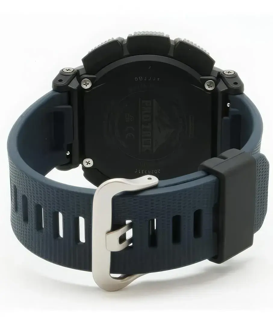 Мужские кварцевые электронные наручные часы. Серия Casio Pro Trek. Питание от солнечной энергии Tough Solar - источником питания служит светочувствительная панель и аккумулятор, подзаряжаемый при попадании солнечного света на дисплей часов. Автоматическая светодиодная подсветка — при недостаточном освещении поворот руки включит подсветку. Индикатор уровня заряда аккумулятора. Функция энергосбережения (в темноте дисплей гаснет для экономии энергии). Прием радиосигнала (Европа, США, Япония, Китай) для корректировки текущего времени. Барометр (диапазон измерения: от 260 до 1100 гПа) - специальный датчик измеряет давление воздуха и отображает измеренное значение на экране в виде символа. Термометр (-10°C / +60°C) - датчик измеряет температуру окружающего воздуха вокруг часов и отображает ее на экране в градусах °C. Встроенный цифровой компас. Диапазон измерения от 0° до 359° с точностью 1°. Альтиметр (высотомер) 10 000 м - встроенный датчик давления определяет изменения в атмосферном давлении и преобразовывает полученные результаты в абсолютную высоту до 10 000 м. График набора высоты. Память данных высотомера - можно сохранить до 40 записей о высотных точках рельефа местности. Мировое время - 48 городов (31 часовой пояс), настройка летнего времени, всемирное координированное время (UTC). Отображение времени восхода/захода солнца. Секундомер с точностью измерения 1/10 секунды и временем измерения 1000 ч. Режимы измерения: прошедшее время, промежуточное время, два финишных результата. Таймер обратного отсчёта от 1 минуты до 24 часов с автоповтором.. 5 ежедневных будильников, сигнал начала часа. Включение/выключение звука кнопок. Система Smart Access с помощью переводной головки обеспечивает простой и удобный доступ ко всем важным функциям часов - нажатие или поворот переводной головки позволяет переключаться между различными режимами и активировать будильник, таймер, секундомер, а также настраивать функцию мирового времени. Автоматический календарь до 2099 года. 12/24-х часовой формат отображения времени. Часы устойчивы к низким температурам (-10 °C). Круглый корпус из полимерного пластика. Диаметр корпуса 51,7 мм, толщина 14,6 мм. Вращающийся стальной безель с шкалой компаса. Устойчивое к мелким механическим повреждениям минеральное стекло. Пластиковый ремешок синего цвета со стандартной застёжкой Buckle. Водонепроницаемость 100WR (плавание и погружение без акваланга). Вес около 63 г.