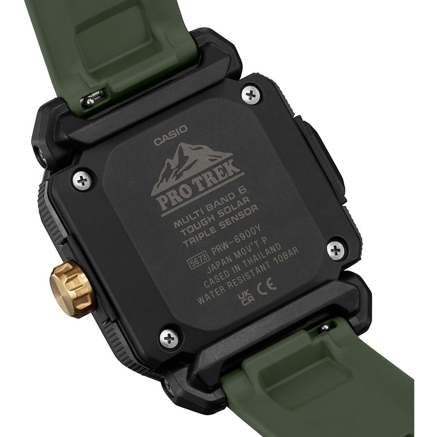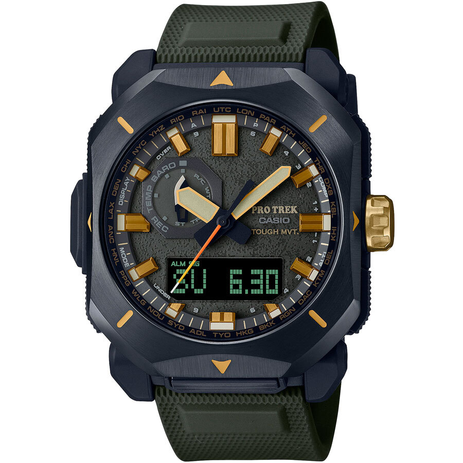Мужские кварцевые аналогово-цифровые наручные часы. Серия Casio Pro Trek. Полностью автоматическая светодиодная подсветка - поворот руки при недостаточном освещении обеспечит автоматическое включение подсветки дисплея. Неоновый дисплей - светящееся покрытие обеспечивает длительную подсветку в темное время суток после короткого воздействия света. Питание от солнечной энергии Tough Solar - источником питания служит светочувствительная панель и аккумулятор, подзаряжаемый от солнечного света. Индикатор заряда батареи. Функция автоматического сохранения энергии. Функция энергосбережения (дисплей гаснет и стрелки останавливаются для экономии энергии, когда часы остаются в темноте). Прием радиосигнала (Европа, США, Япония, Китай) для корректировки текущего времени. Барометр (260 / 1.100 hPa) - специальный датчик измеряет давление воздуха (диапазон измерений составляет 260 / 1100 гПа, 1 гПа = 0,75 мм рт ст или 1 мм рт ст = 1,333 гПа) и отображает измеренное значение на экране в виде символа. Термометр (-10°C / +60°C) - датчик измеряет температуру окружающего воздуха вокруг часов и отображает ее на экране в градусах °C (-10°C /+60°C). Цифровой компас. Альтиметр (высотомер) 10 000 м - встроенный датчик давления определяет изменения в атмосферном давлении и преобразовывает полученные результаты в абсолютную высоту до 10 000 м. График набора высоты. Память данных высотомера - можно сохранить до 40 записей о высотных точках рельефа местности. Функция мирового времени. Функция секундомера с точностью измерений 1/100 секунды и пределом измерения 24 часа. Таймер обратного отсчёта - время можно предварительно настроить от 1 минуты и до 1 часа. Часы могут затем автоматически начать отсчет в обратную сторону в установленное время. 5 ежедневных будильников. Функция автоматической коррекции положения стрелок проверяет положение стрелок каждый час и корректирует его в случае необходимости. Включение/выключение звука кнопок. Функция перемещения стрелок. Система Smart Access с помощью переводной головки обеспечивает простой и удобный доступ ко всем важным функциям часов - нажатие или поворот переводной головки позволяет переключаться между различными режимами и активировать будильник, таймер, секундомер, а также настраивать функцию мирового времени. Автоматический календарь. 12/24-х часовой формат времени. Корпус устойчивый к низким температурам (-10 °C). Корпус из полимерного пластика, стальной безель с покрытием. Переводная головка с защитой. Ремешок из полимерного пластика.