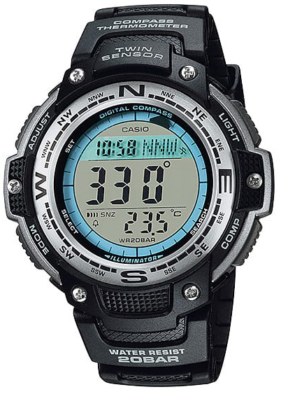 Мужские кварцевые наручные часы c цифровым отображением времени. Коллекция Sports Gear. Электролюминесцентная подсветка освещает весь циферблат, послесвечение. Модуль часов рассчитан на работу при низких температурах (до (-10 °C). Встроенный термометр - датчик измеряет температуру окружающего воздуха вокруг часов и отображает ее на экране в градусах °C (от -10°C до +60°C). Встроенный цифровой компас определяет северный магнитный полюс. Мировое время - 48 городов (29 часовых поясов). Секундомер с точностью показаний 1/100 секунды и временем измерения 1 час. Режимы измерений отдельные отрезки времени, время с промежуточным результатом, два финишных результата. Таймер обратного отсчёта от 1 мин и до 24 часов с функцией автоповтора. 5 ежедневных будильников, один с функцией повтора сигнала будильника Snooze, сигнал начала часа. 12-ти и 24-х часовой формат отображения времени. Функция отключения/включения звука кнопок. Автоматический календарь до 2099г. Круглый корпус из полимерного пластика чёрного цвета, алюминиевый безель. Размеры корпуса 47,6 мм на 51,5мм, толщина 13,2мм. Минеральное стекло устойчивое к мелким механическим повреждениям. Чёрный пластиковый ремешок с классической застёжкой buckle. Батарея рассчитана на 3 года. Водонепроницаемость 200WR (часы подходят для плавания с маской, трубкой, обычного плавания). Вес около 55 г.