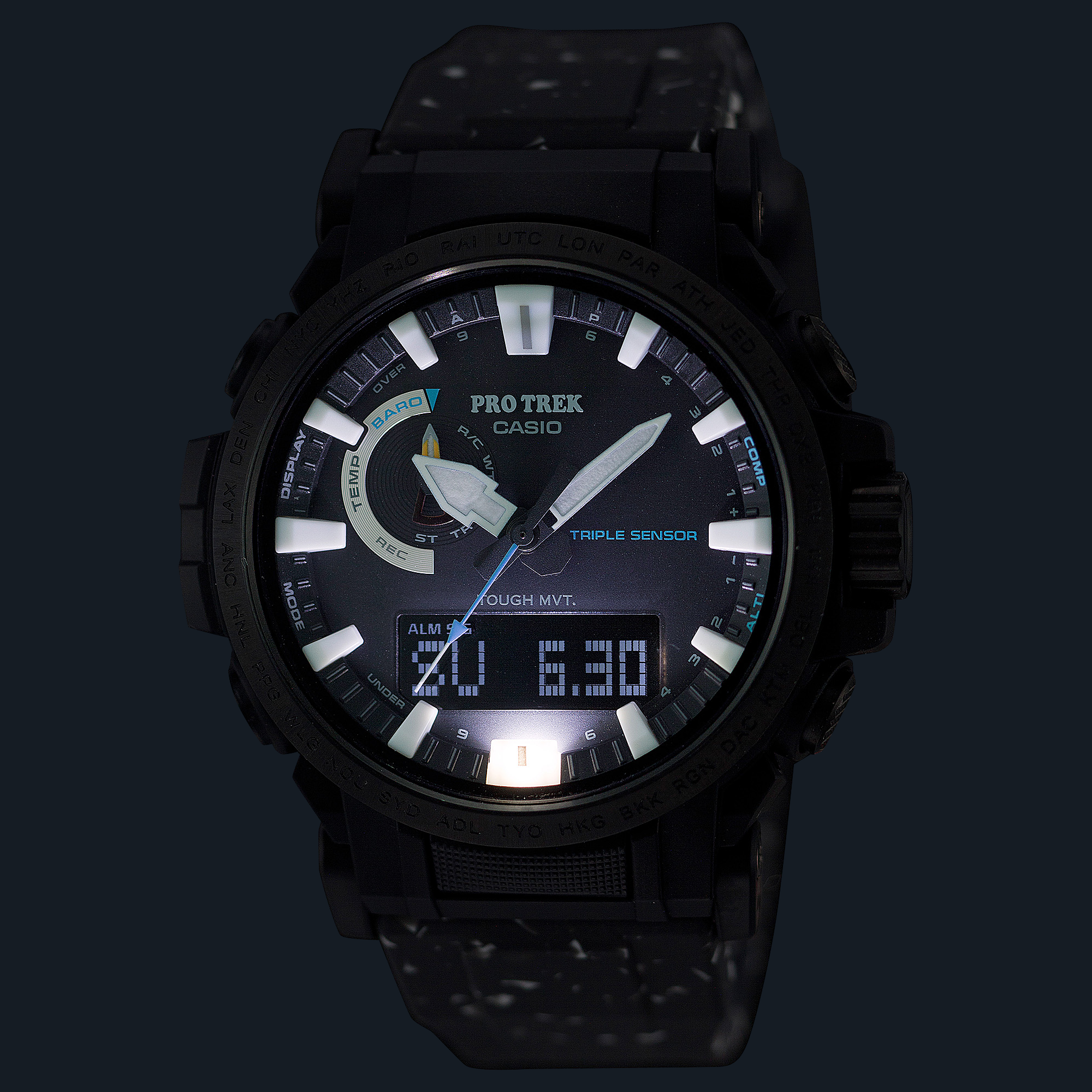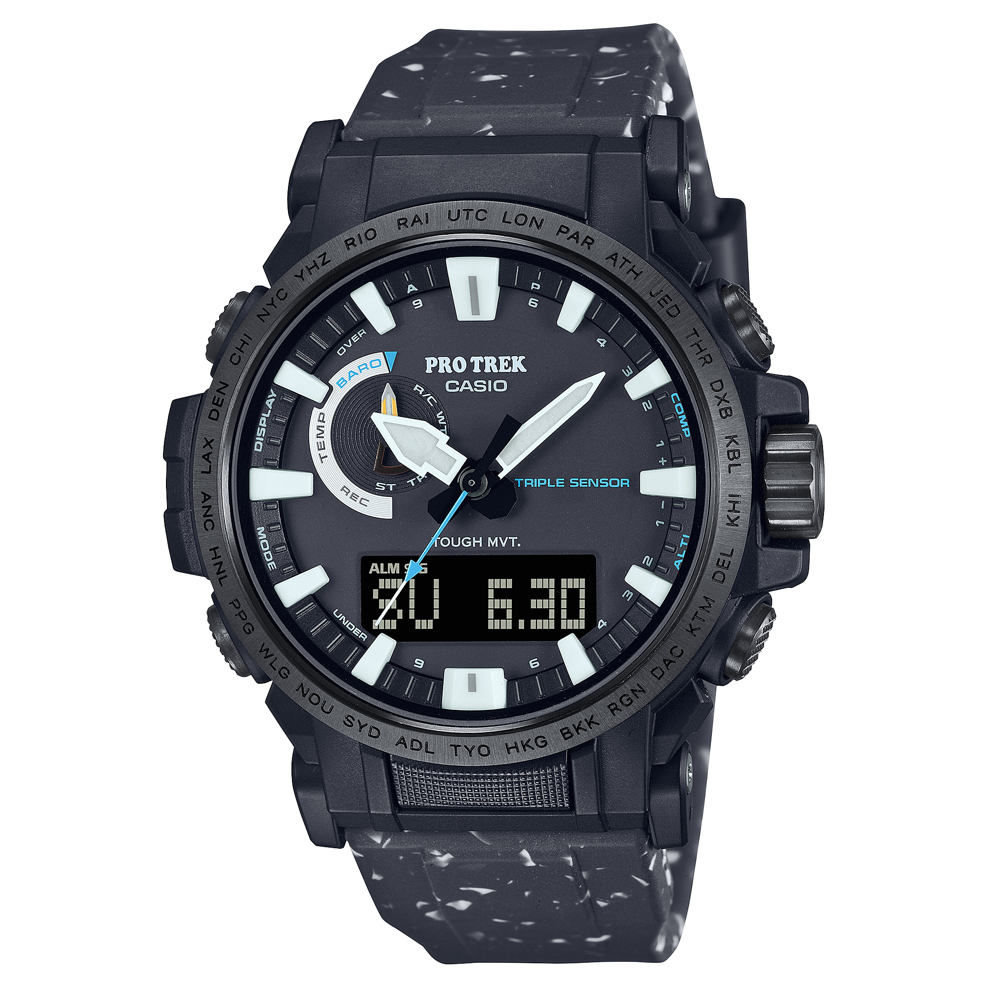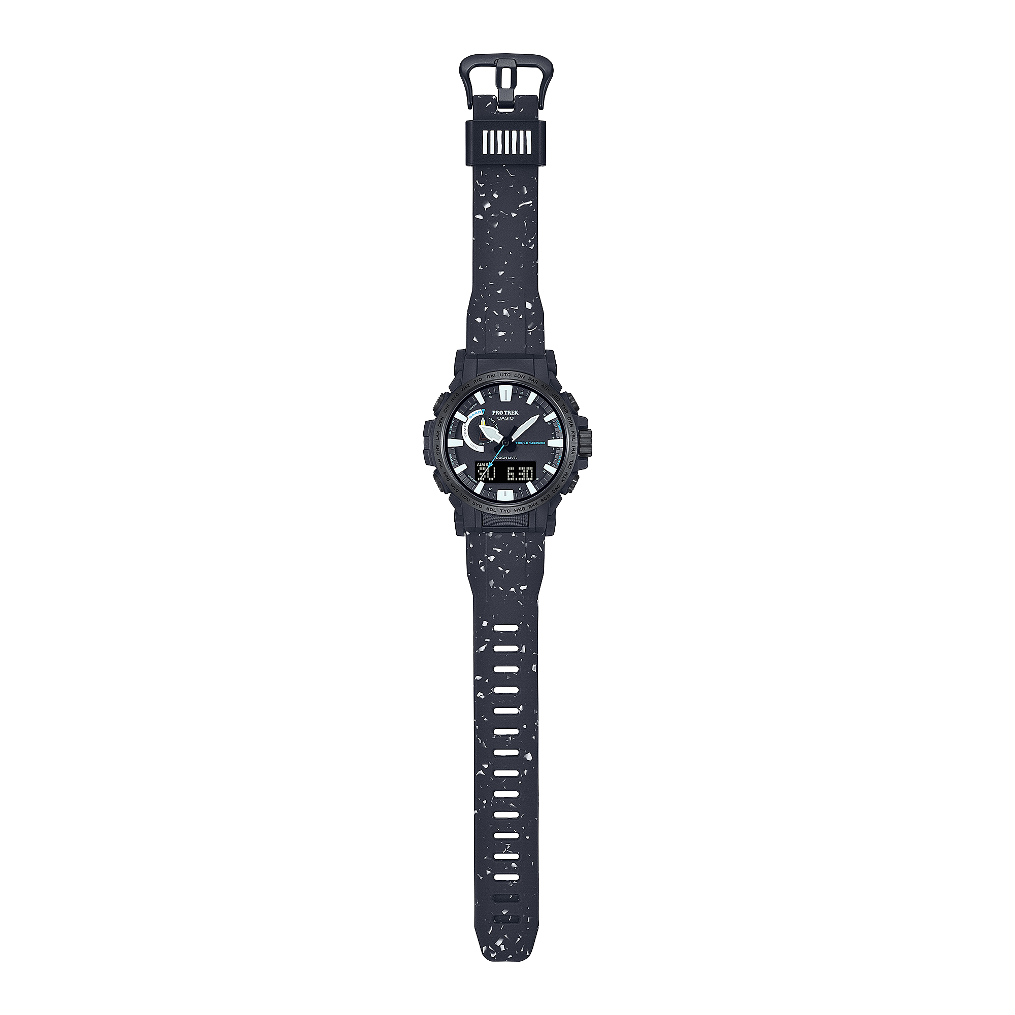 Мужские кварцевые аналогово-цифровые наручные часы. Серия Casio Pro Trek. Специальная серия, разработанная в сотрудничестве с Nature Conservation Society of Japan (организацией, занимающейся проблемой гармоничного сосуществования человека и природы). Дизайн новинки с акцентом на голубые и белые вкрапления напоминает о природе Минаками, горного района на севере префектуры Гумма, где расположена гора Оминаками и берет свое начало река Тоне. Именно эффект снегопада и передали дизайнеры Casio с помощью уникального решения ремешка. Полностью автоматическая светодиодная подсветка - поворот руки при недостаточном освещении обеспечит автоматическое включение подсветки дисплея. Светящееся покрытие стрелок обеспечивает длительное послесвечение в темное время суток после короткого воздействия света. Питание от солнечной энергии (технология Tough Solar) - источником питания служит светочувствительная панель и аккумулятор, подзаряжаемый при попадании солнечного света на циферблат часов. Индикатор заряда батареи. Функция автоматического сохранения энергии. Функция энергосбережения (в темноте дисплей гаснет и стрелки останавливаются для экономии энергии). Прием радиосигнала (Европа, США, Япония, Китай) для корректировки текущего времени. Барометр - специальный датчик измеряет давление воздуха (диапазон измерений составляет 260 / 1100 гПа) и отображает измеренное значение на экране в виде символа. Термометр - датчик измеряет температуру окружающего воздуха вокруг часов и отображает ее на экране в градусах °C (-10°C /+60°C). Цифровой компас. Альтиметр (высотомер) - встроенный датчик давления определяет изменения в атмосферном давлении и преобразовывает полученные результаты в высоту от –700 до 10 000 м. График набора высоты. Память данных высотомера - можно сохранить до 40 записей о высотных точках рельефа местности. Мировое время - 29 городов (29 часовых поясов), всемирное координированное время ( UTC), настройка стандартного/летнего времени. Секундомер с точностью измерения 1/10 секунды и временем измерения 24 часа. Режимы измерения: прошедшее время, промежуточное время, два финишных результата. Таймер обратного отсчёта от 1 минуты до 1 часа с автоповтором. 5 ежедневных будильников, сигнал начала часа. Функция автоматической коррекции стрелок проверяет положение стрелок каждый час и корректирует его в случае необходимости. Включение/выключение звука кнопок. Функция перемещения стрелок для удобного просмотра информиции на цифровом экране. Технология Smart Access с помощью переводной головки обеспечивает простой и удобный доступ ко всем важным функциям часов - нажатие или поворот переводной головки позволяет переключаться между различными режимами и активировать будильник, таймер, секундомер, а также настраивать функцию мирового времени. Автоматический календарь до 2099 года. 12/24-х часовой формат отображения времени. Часы устойчивы к низким температурам (-10 °C). Круглый корпус из биопластика чёрного цвета. Устойчивое к мелким механическим повреждениям минеральное стекло. Переводная головка с защитой. На задней крышке гравировка с беркутом парящим над горами— символом региона, где находится гора Оминаками; стрелка индикатора режимов (на дополнительном циферблате в положении «10 часов») желто-серого цвета и стилизована под клюв беркута. Среда обитания этой хищной птицы находи