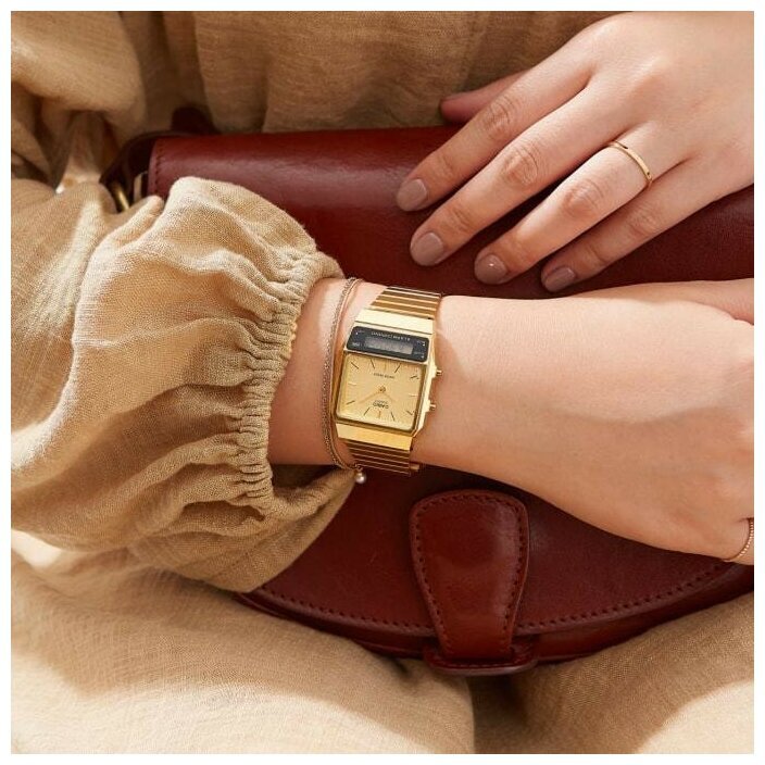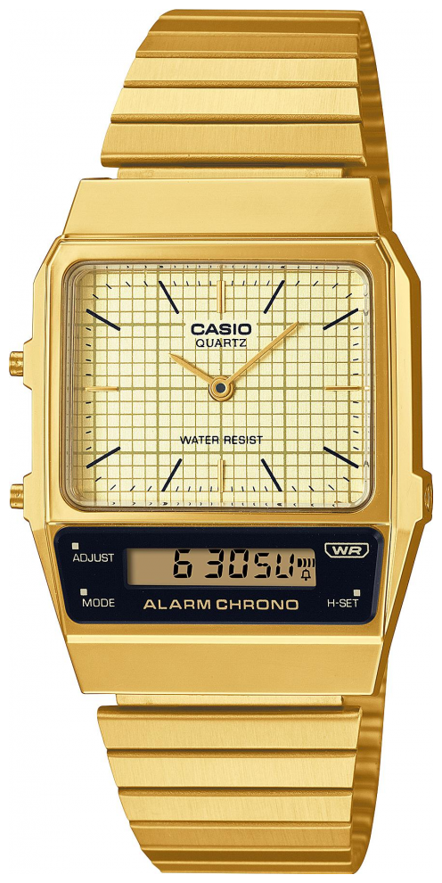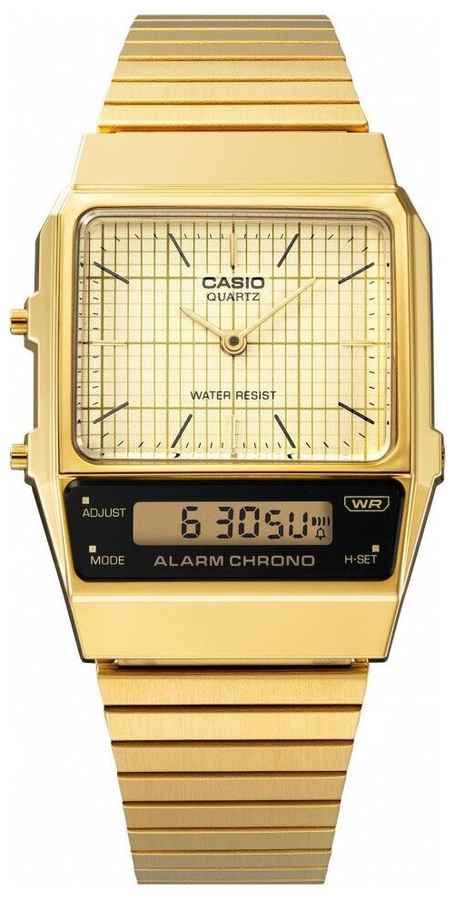 Кварцевые часы. Центральные часовая и минутная стрелки. Кремовый циферблат. Дополнительный циферблат мирового времени. Функция секундомера с точностью 1/100 секунды и пределом измерения 1 час. Ежедневный будильник. Автоматический календарь. 12/24х часовой формат времени. Корпус выполнен из полимерного пластика золотистого цвета. Размер корпуса составляет 40,7 x 32,1 x 8,7 мм. Стальной браслет с золотистым IP покрытием, раскладывающаяся застежка. Акриловое стекло. Водостойкие (брызги). Вес примерно 52 гр.
