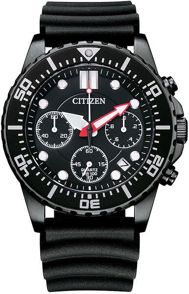 Мужские аналоговые кварцевые часы-хронограф с секундомером. Коллекция Chrono Quartz. Калибр механизма 6520. Центральные часовая и минутная стрелки, секундная стрелка вынесена на дополнительный малый циферблат в позиции 6 часов. Чёрный циферблат с часовыми метками в виде штрихов. Стрелки и метки с люминесцентным покрытием, которое светится в темноте после непродолжительного воздействия света. Окошко даты в позиции между 4 и 5 ч. Секундомер с точностью измерения 1/20 с. Однонаправленный поворотный безель с минутной шкалой и покрытием чёрного цвета. Круглый стальной корпус. Диаметр корпуса 43 мм, толщина 14 мм. Устойчивое к мелким механическим повреждениям минеральное стекло. Чёрный пластиковый ремешок с классической застёжкой. Водозащита WR 100 (плавание с маской и трубкой.).