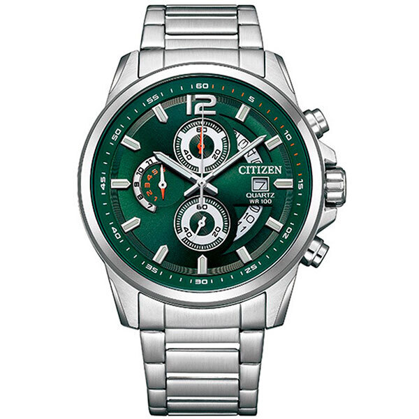 Мужские аналоговые кварцевые наручные часы-хронограф с секундомером. Калибр механизма 0510. Центральные часовая и минутная стрелки, секундная стрелка вынесена на дополнительный малый циферблат в позиции 6 часов. Зелёный циферблат с часовыми метками в виде штрихов. Стрелки и метки с люминесцентным покрытием, которое светится в темноте после непродолжительного воздействия света. Окошко даты в позиции 3 ч. Переводная головка с защитой. Секундомер с точностью показаний 1с и временем измерения 12ч. Круглый стальной корпус диаметром 44 мм, толщиной 11,6 мм. Устойчивое к мелким механическим повреждениям минеральное стекло. Стальной браслет с раскладывающейся застежкой. Водозащита WR 100 (плавание и погружение без акваланга). Вес около 117 г.