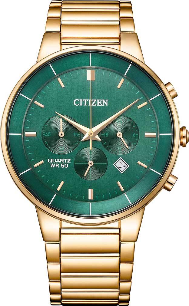 Мужские аналоговые кварцевые часы-хронограф с секундомером. Коллекция Chrono Quartz. Калибр механизма Citizen 0520. Центральные часовая и минутная стрелки, секундная стрелка вынесена на дополнительный малый циферблат в позиции 6 часов. Зелёный циферблат с часовыми метками в виде штрихов. Окошко даты в позиции между 4 и 5 ч. Стрелочный указатель времени суток с 24-х часовой шкалой. Секундомер с точностью показаний 1c и временем измерения 60мин. Круглый стальной корпус с покрытием цвета розового золота. Диаметр корпуса 42 мм. Устойчивое к мелким механическим повреждениям минеральное стекло. Стальной браслет с покрытием цвета розового золота, раскладывающаяся застежка. Водозащита WR 50 (мытьё рук, дождь). Вес около 118 г.