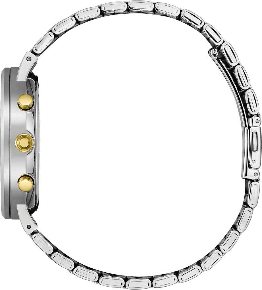 Мужские аналоговые кварцевые часы-хронограф с секундомером. Коллекция Chrono Quartz. Калибр механизма Citizen 0520. Центральные часовая и минутная стрелки, секундная стрелка вынесена на дополнительный малый циферблат в позиции 6 часов. Синий циферблат с часовыми метками в виде штрихов. Окошко даты в позиции между 4 и 5 ч. Стрелочный указатель времени суток с 24-х часовой шкалой. Секундомер с точностью показаний 1c и временем измерения 60мин. Круглый стальной корпус диаметром 42 мм. Устойчивое к мелким механическим повреждениям минеральное стекло. Стальной браслет с частичным покрытием цвета розового золота, раскладывающаяся застежка. Водозащита WR 50 (мытьё рук, дождь). Вес около 118 г.