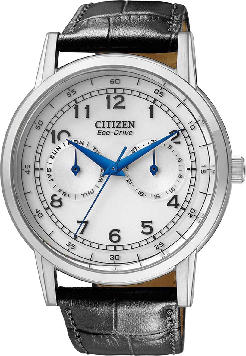 Мужские кварцевые аналоговые часы на солнечной батарее. Коллекция Citizen Eco-Drive. Калибр механизма Citizen 8635. Часы оснащенный системой питания и подзарядки от солнечного света Eco-Drive не требующей замены батарейки. Система Eco-Drive - патентованная технология компании Citizen, заключающаяся в размещении фотоэлементов скрытых под циферблатом и постоянно заряжающих аккумулятор часов при попадании солнечного света на циферблат. Время работы при полностью заряженной батареи до 180 дней. Функция индикации заряда (EOL - End of Life) – в случае ослабевания заряда элемента питания, секундная стрелка двигается с интервалом в 2 секунды. Функция предотвращения перезарядки аккумулятора. Белый циферблат с часовыми метками в виде арабских цифр. Центральные часовая, минутная и секундная стрелки. Дата и день недели вынесены на отдельные малые циферблаты (дата в позиции 3 ч, день недели в позиции 9 ч). Минутная шкала на циферблате. Круглый стальной корпус диаметром 42 мм, толщиной 11.6 мм. Устойчивое к мелким механическим повреждениям минеральное стекло. Чёрный кожаный ремешок с классической застежкой buckle. Ширина ремешка 22 мм. Водонепроницаемость WR30 (защита от брызг). Вес около 58 г.