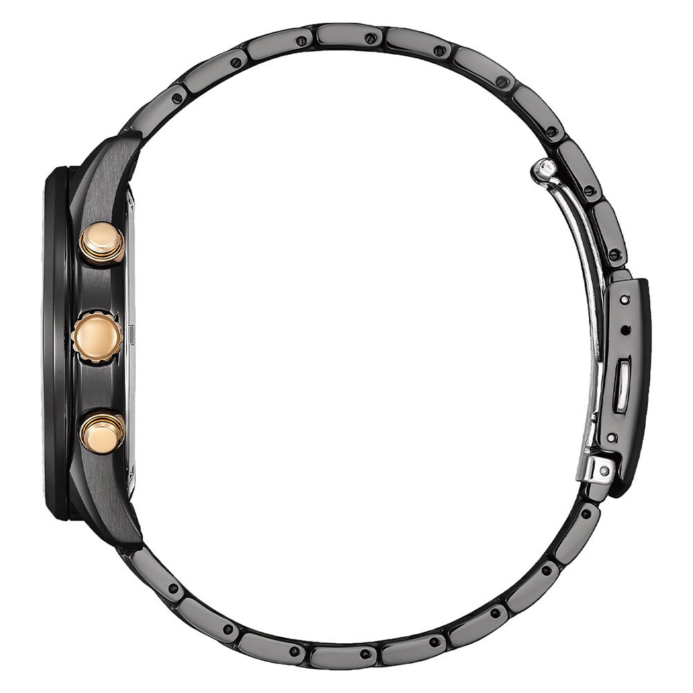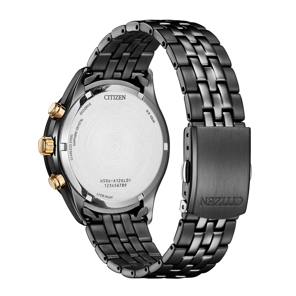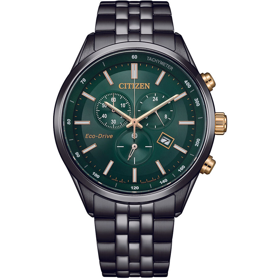 Мужские кварцевые аналоговые часы-хронограф с секундомером и тахиметром. Серия Ecо-Drive Chronograph. Калибр механизма Citizen H504. Часы оснащенный системой питания и подзарядки от солнечного света Eco-Drive не требующей замены батарейки. Система Eco-Drive - патентованная технология компании Citizen заключающаяся в размещении фотоэлементов скрытых под циферблатом и постоянно подзаряжающих аккумулятор часов при попадании солнечного света на циферблат. Запас хода без подзарядки до 5 месяцев. Функция предотвращения перезарядки. Зелёный циферблат с часовыми метками в виде штрихов. Центральные часовая и минутная стрелки, секундная стрелка вынесена на дополнительный малый циферблат в позиции 6 ч. Окошко даты в позиции 4 часов. Стрелки и метки с люминесцентным покрытием, которое светится в темноте после непродолжительного воздействия света. 12/24х часовой формат отображения времени. Функция индикации заряда (EOL - End of Life – в случае ослабевания заряда элемента питания, секундная стрелка двигается через деления). Секундомер. Тахиметрическая шкала на циферблате для расчета скорости на основании времени в пути. Круглый корпус из нержавеющей стали с покрытием чёрного цвета. Диаметр корпуса 42 мм, толщина 10,5 мм. Устойчивое к возникновению мелких царапин сапфировое стекло. Стальной браслет с покрытием чёрного цвета, раскладывающаяся застежка. Водозащита WR 100 (плавание с маской и трубкой).