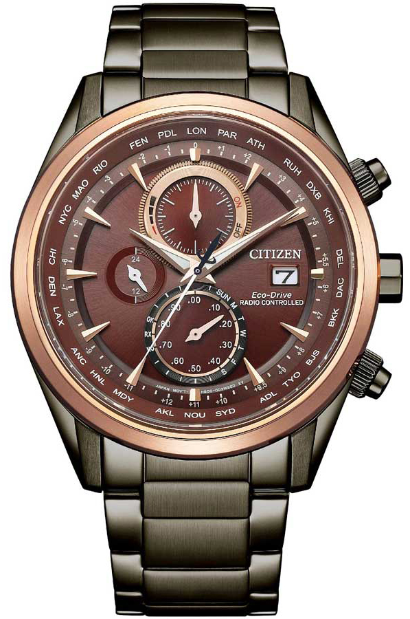 Мужские кварцевые аналоговые часы- хронограф с секундомером на солнечной батарее. Коллекции Eco-Drive Radio-Controlled. Калибр механизма H800. Часы оснащены системой питания и подзарядки от солнечного света Eco-Drive не требующей замены элемента питания. Система Eco-Drive - патентованная технология CIitizen заключающаяся в размещении фотоэлементов скрытых под циферблатом и постоянно подзаряжающих аккумулятор часов при попадании солнечного света на цифербоат. Система предупреждения о низком уровне заряда аккумулятора и предотвращения перезарядки. Индикатор запаса хода. Запас хода при полной зарядке аккумулятора около 6 месяцев, в режиме сохранения заряда элемента питания около 10 месяцев. Функция индикации заряда (EOL - End of Life) – в случае ослабевания заряда элемента питания, секундная стрелка двигается с интервалом в 2 секунды. Синхронизация времени по радиосигналу (Германия, Япония, США, Китай). Часы созданы с защитой от магнитных полей. Центральные часовая, минутная и секундная стрелки. Коричневый циферблат с часовыми метками в виде штрихов. Стрелки с люминесцентным покрытием, которое светится в темноте после непродолжительного воздействия света. Окошко даты в позиции 3 ч. Ретроградный стрелочный указатель дня недели вынесен на дополнительный малый циферблат в позиции 6 ч. Секундомер с точностью показаний 1/20 c и временем измерения до 1 ч. 12-ти и 24-х часовой формат отображения времени (малый циферблат в позиции 9 ч). Мировое время (26 городов). Вечный календарь. Включение/отключение летнего времени. Круглый стальной корпус с покрытием чёрного цвета. Диаметр корпуса 43 мм, толщина 10 мм. Устойчивое к возникновению мелких царапин сапфировое стекло с антибликовым покрытием. Стальной браслет с покрытием чёрного цвета, раскладывающаяся застежка. Водозащита 100WR (плавание и погружение без акваланга).