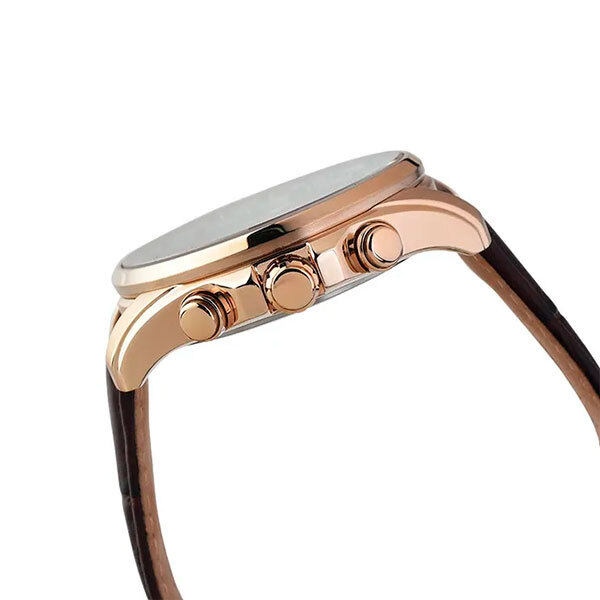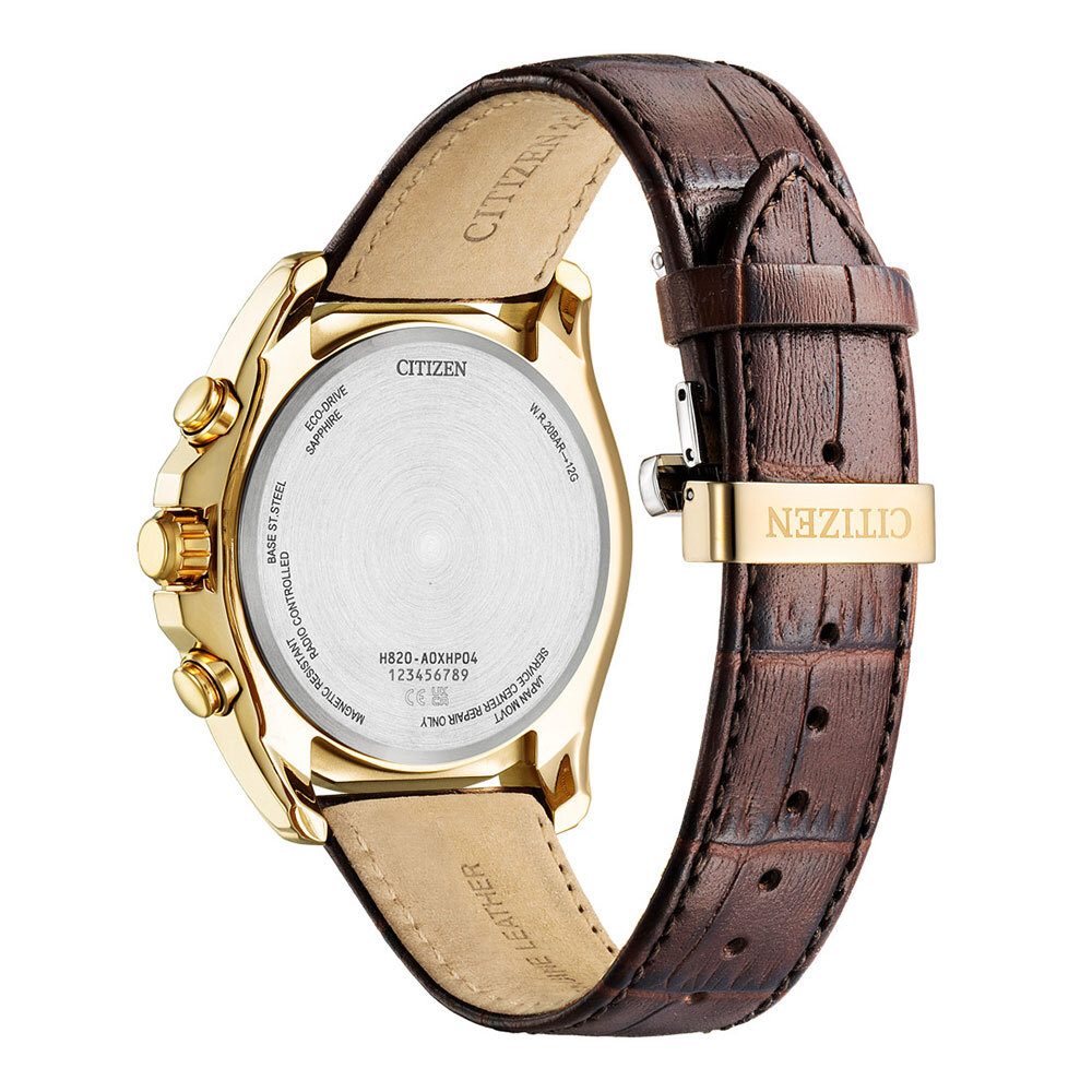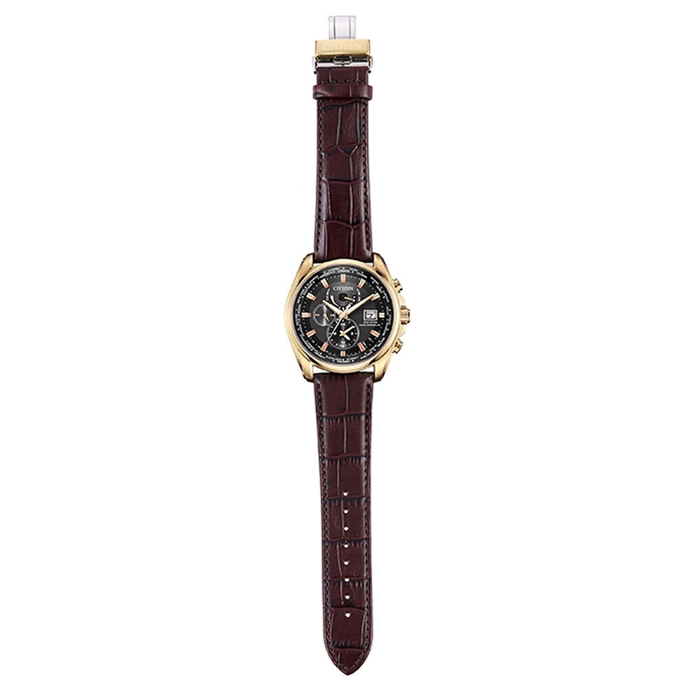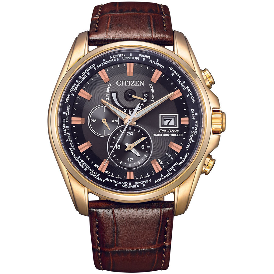 Мужские кварцевые аналоговые часы- хронограф с секундомером на солнечной батарее. Коллекции Eco-Drive Radio-Controlled. Калибр механизма H800. Часы оснащены системой питания и подзарядки от солнечного света Eco-Drive не требующей замены элемента питания. Система Eco-Drive - патентованная технология CIitizen заключающаяся в размещении фотоэлементов скрытых под циферблатом и постоянно заряжающих аккумулятор часов при попадании солнечного света на циферблат. Запас хода при полной зарядке аккумулятора до 180 дней, при включенной функции сохранения энергии до 10 месяцев. Функция индикации заряда (EOL - End of Life) – в случае ослабевания заряда элемента питания секундная стрелка двигается через 2 деления. Функция предотвращения перезарядки. Автоматическая настройка времени по радиосигналу (Германия, Япония, США, Китай). Часы созданы с защитой от магнитных полей. Центральные часовая, минутная и секундная стрелки. Чёрный циферблат с часовыми метками в виде штрихов. Стрелки с люминесцентным покрытием, которое светится в темноте после непродолжительного воздействия света. Окошко даты в позиции 3 ч. Ретроградный стрелочный указатель дня недели вынесен на дополнительный малый циферблат в позиции 12 ч. Стрелочный указатель времени суток на дополнительном малом циферблате в положении 9 часов. Мировое время (26 городов). Второй часовой пояс. Вечный календарь. Будильник. Включение/отключение летнего времени. Круглый стальной корпус с IP покрытием цвета розового золота. Диаметр корпуса 44,3 мм, толщина 11,8 мм. Переводная головка с защитой. Устойчивое к возникновению мелких царапин сапфировое стекло с антибликовым покрытием. Коричневый кожаный ремешок с тройной раскладывающейся застежкой. Ширина ремешка 23 мм. Водонепроницаемость 200WR (часы подходят для плавания с маской, трубкой и обычного плавания). Вес около 82 г.