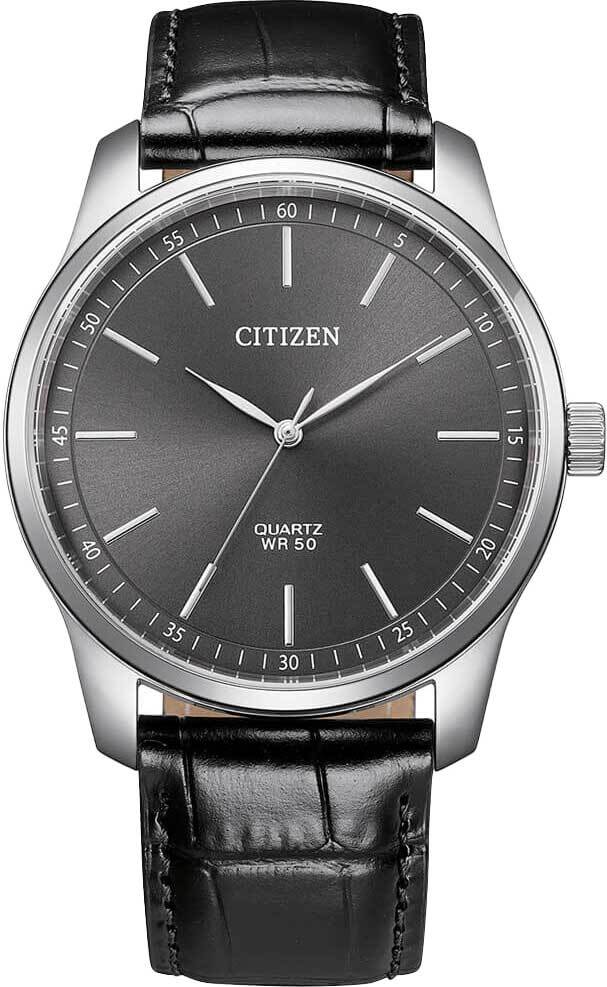 Мужские кварцевые наручные часы с аналоговым отображением времени. Коллекция Basic. Калибр механизма Citizen G032. Центральные часовая, минутная и секундная стрелки. Серый циферблат с часовыми метками в виде штрихов выполнен по технологии Sunray (солнечные лучи). Круглый стальной корпус диаметром 42 мм, толщиной 9 мм. Устойчивое к мелким механическим повреждениям минеральное стекло. Чёрный кожаный ремешок с классической застежкой buckle. Ширина ремешка 22мм. Водонепроницаемость 50WR (мытьё рук, дождь). Вес около 54 г.