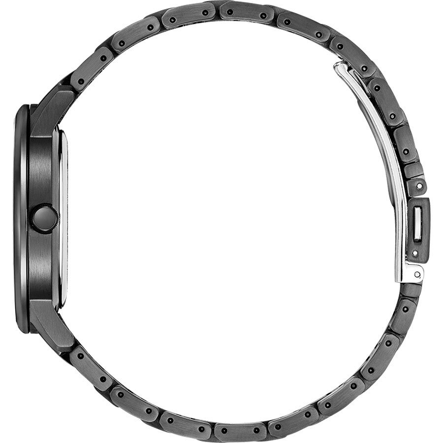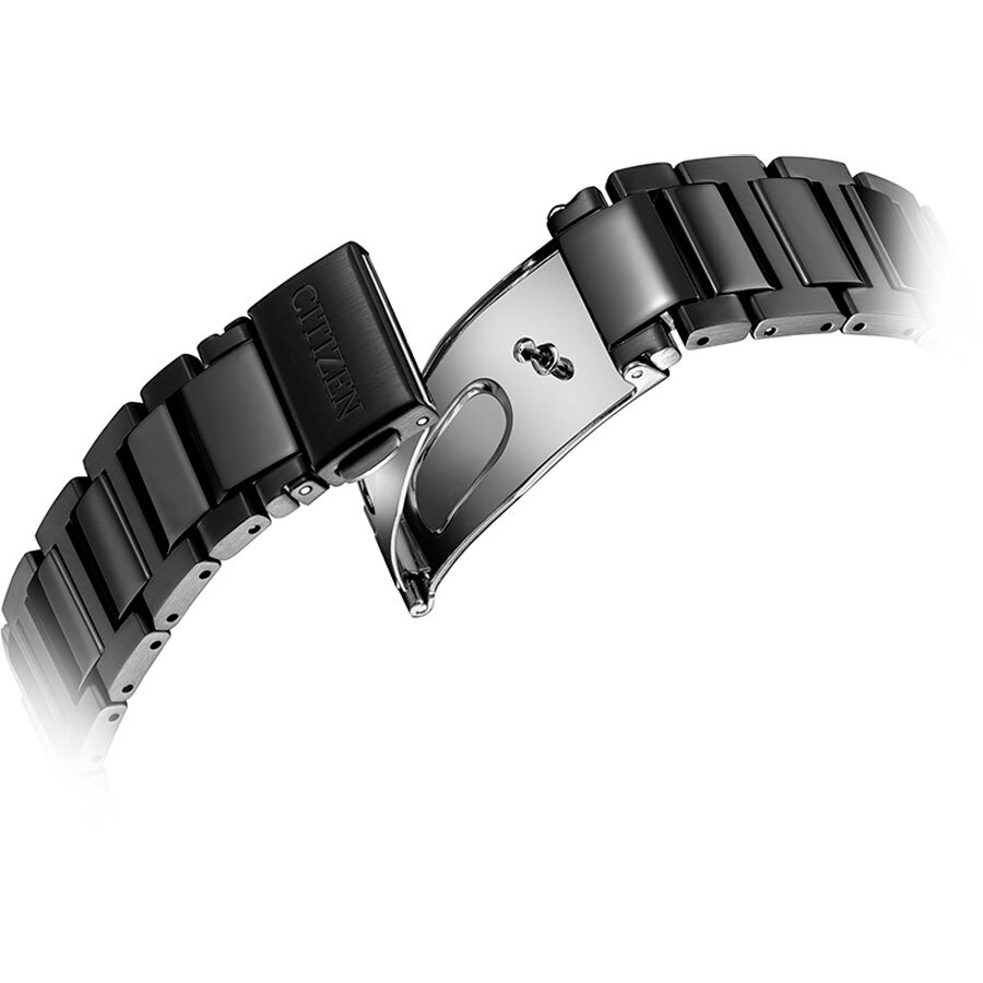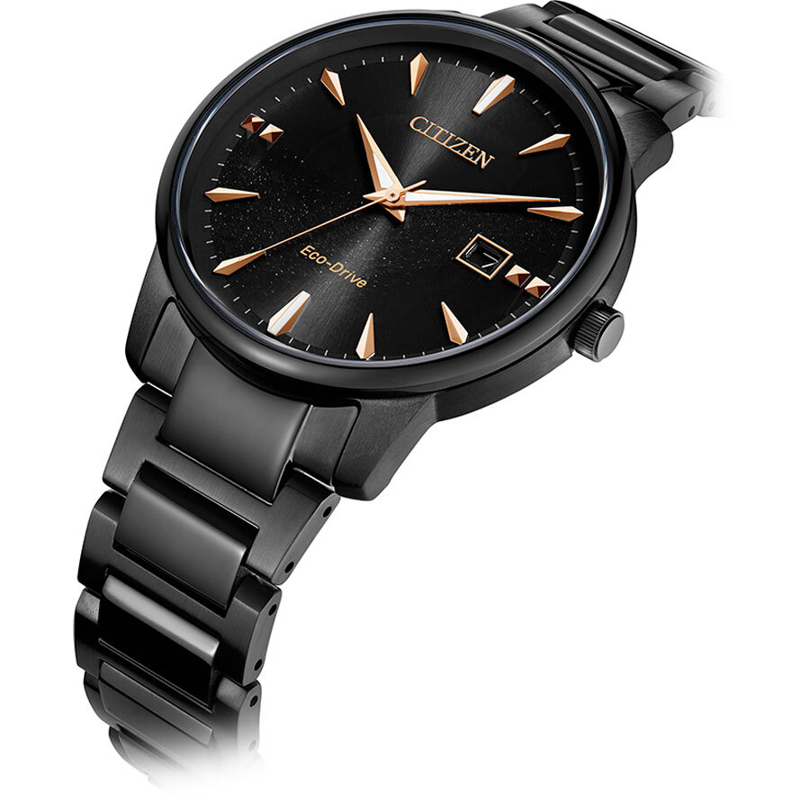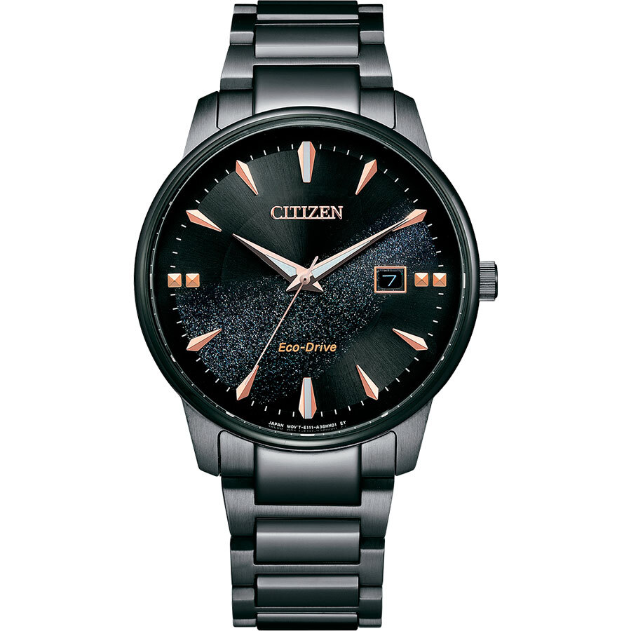 Мужские кварцевые аналоговые часы на солнечной батарее. Коллекция Eco-Drive. Калибр механизма E111. Часы оснащенный системой питания и подзарядки от солнечного света Eco-Drive не требующей замены элемента питания. Система Eco-Drive - патентованная технология Citizen заключающаяся в размещении фотоэлементов скрытых под циферблатом и постоянно заряжающих аккумулятор часов при попадании солнечного света на циферблат. Запас хода при полной зарядке аккумулятора до 180 дней. Функция предотвращения перезарядки. Функция индикации заряда (EOL - End of Life) – в случае ослабевания заряда элемента питания секундная стрелка двигается через 2 деления. Центральные часовая, минутная и секундная стрелки. Индикация даты в позиции 3 часов. Стрелки с люминесцентным покрытием, которое светится в темноте после непродолжительного воздействия света. Чёрный циферблат с часовыми метками в виде штрихов. Устойчивое к возникновению мелких царапин сапфировое стекло. Круглый стальной корпус с чёрным IP покрытием. Диаметр корпуса 39,2 мм, толщина 9,5 мм. Стальной браслет с черным IP покрытием, раскладывающаяся застежка. Водонепроницаемость 50WR (мытьё рук, дождь). Вес около 115 г