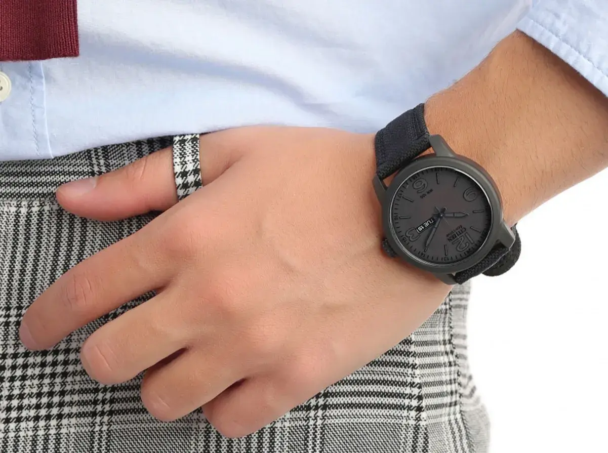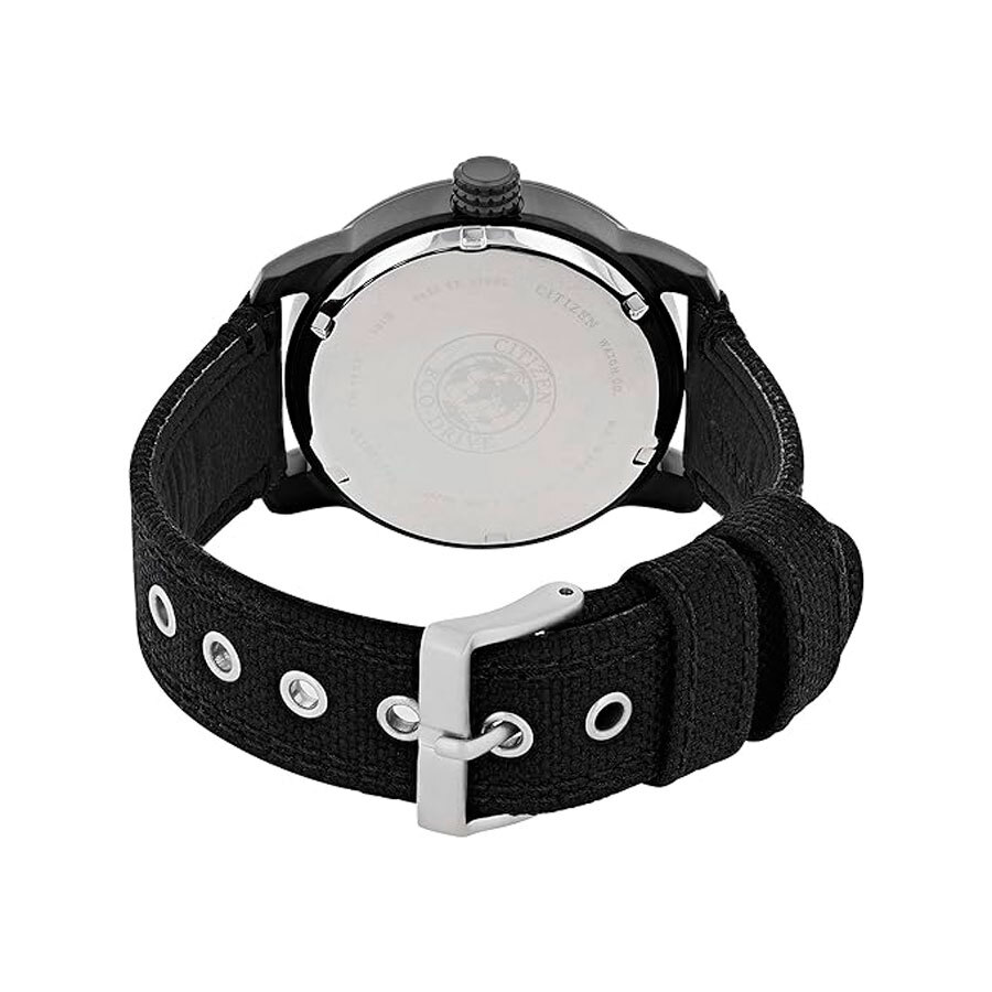 Мужские кварцевые аналоговые часы на солнечной батарее. Коллекция Eco-Drive. Калибр механизма E101. Часы оснащенный системой питания и подзарядки от солнечного света Eco-Drive не требующей замены элемента питания. Система Eco-Drive - патентованная технология Citizen заключающаяся в размещении фотоэлементов скрытых под циферблатом и постоянно заряжающих аккумулятор часов при попадании солнечного света на циферблат. Запас хода при полной зарядке аккумулятора до 180 дней. Функция предотвращения перезарядки. Функция индикации заряда (EOL - End of Life) – в случае ослабевания заряда элемента питания секундная стрелка двигается через 2 деления. Центральные часовая, минутная и секундная стрелки. Индикация даты и дня недели в позиции 3 часов. Стрелки и метки с люминесцентным покрытием, которое светится в темноте после непродолжительного воздействия света. Чёрный циферблат с часовыми метками в виде штрихов и арабских цифр. 24- х часовая шкала на циферблате. Устойчивое к мелким механическим повреждения минеральное стекло. Круглый стальной корпус с чёрным IP покрытием. Диаметр корпуса 42 мм, толщина 11 мм. Чёрный тканевый ремешок на кожаной подложке, классическая застёжка buckle. Ширина ремешка 22 мм. Водонепроницаемость 100WR (часы подходят для плавания с маской, трубкой и обычного плавания). Вес около 67 г