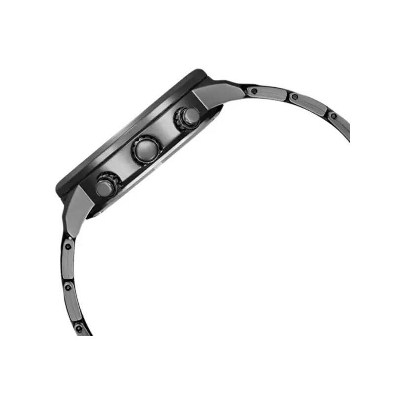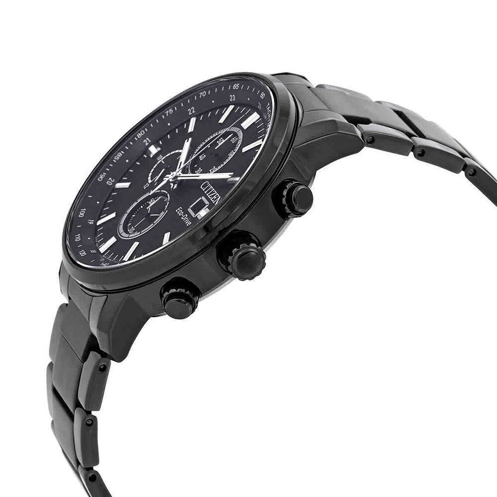 Мужские кварцевые аналоговые часы-хронограф с секундомером на солнечной батарее. Коллекция Eco-Drive . Калибр механизма Citizen B612. Часы оснащенный системой питания и подзарядки от солнечного света Eco-Drive не требующей замены батарейки. Система Eco-Drive - патентованная технология компании Citizen, заключающаяся в размещении фотоэлементов скрытых под циферблатом и постоянно заряжающих аккумулятор часов при попадании солнечного света на циферблат. Время работы при полностью заряженной батареи до 210 дней. Функция индикации заряда (EOL - End of Life) – в случае ослабевания заряда элемента питания, секундная стрелка двигается с интервалом в 2 секунды. Функция предотвращения перезарядки аккумулятора. Чёрный циферблат с часовыми метками в виде штрихов. Центральные часовая и минутная стрелки, секундная стрелка вынесена на дополнительный малый циферблат в позиции 6 ч. Стрелки и часовые метки с люминесцентным покрытием, которое светится в темноте после непродолжительного воздействия света. Индикация даты в позиции 3 ч. Время в 24-х часовом формате вынесено на отдельный малый циферблат в позиции 9ч. Секундомер с точностью показаний 1/5c и временем измерения 1ч. Тахиметрическая шкала на циферблате (для расчета скорости на основании времени в пути). Круглый стальной корпус с чёрным IP покрытием. Диаметр корпуса 43 мм, толщина 11.5 мм. Устойчивое к возникновению мелких царапин сапфировое стекло. Стальной браслет с чёрным IP покрытием, раскладывающаяся застежка. Завинчивающаяся задняя крышка. Водонепроницаемость WR100 (часы подходят для плавания с маской и трубкой, обычного плавания).