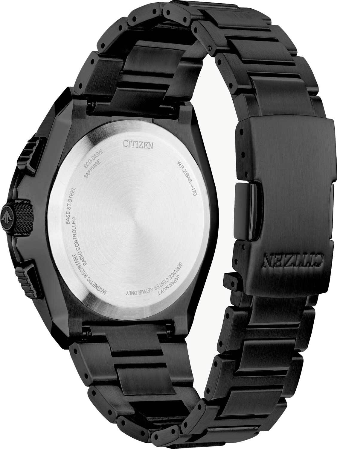 Мужские кварцевые аналого-цифровые часы-хронограф с секундомером на солнечной батарее. Коллекция Promaster Skyhawk. Калибр механизма U680. Часы оснащены системой питания и подзарядки от солнечной энергии Eco-Drive не требующей замены элемента питания. Система Eco-Drive - патентованная технология CIitizen заключающаяся в размещении фотоэлементов под циферблатом и постоянно подзаряжающих аккумулятор часов при попадании солнечного света на циферблат. Система предупреждения о низком уровне заряда аккумулятора и предотвращения перезарядки. Индикатор запаса хода. Запас хода при полной зарядке аккумулятора около 180 дней. Функция индикации заряда (EOL - End of Life) – в случае, если заряд элемента питания ослабевает, секундная стрелка начинает двигаться через 2 деления. Синхронизация времени по радиосигналу (Германия, Япония, США, Китай). Индикатор приема сигнала, индикатор уровня приема сигнала калибровки, подтверждение статуса приема сигнала. Центральные часовая, минутная и секундная стрелки. Чёрный циферблат с часовыми метками в виде штрихов и двух арабских цифр. Стрелки и часовые метки с люминесцентным покрытием, которое светится в темноте после непродолжительного воздействия света. Светодиодная подсветка циферблата. Секундомер с точностью показаний 1/100c и временем измерения 24ч. Таймер обратного отсчета от 1 минуты до 99 минут. Второй часовой пояс. 12-ти и 24-х часовой формат отображения времени. Мировое время (43 города). Вечный календарь. Всемирное координированное время (UTC). Включение/выключение летнего времени. 2 будильника. Вращающийся безель с логарифмической линейкой для пилота. Рифленая переводная головка с защитой. Круглый стальной корпус с покрытием чёрного цвета. Диаметр корпуса 45,7 мм, толщина 14,3 мм. Устойчивое к возникновению мелких царапин сапфировое стекло с антибликовым покрытием. Стальной браслет с покрытием чёрного цвета, раскладывающаяся застежка. Водозащита 200WR (любительский дайвинг). Вес около 185 г.